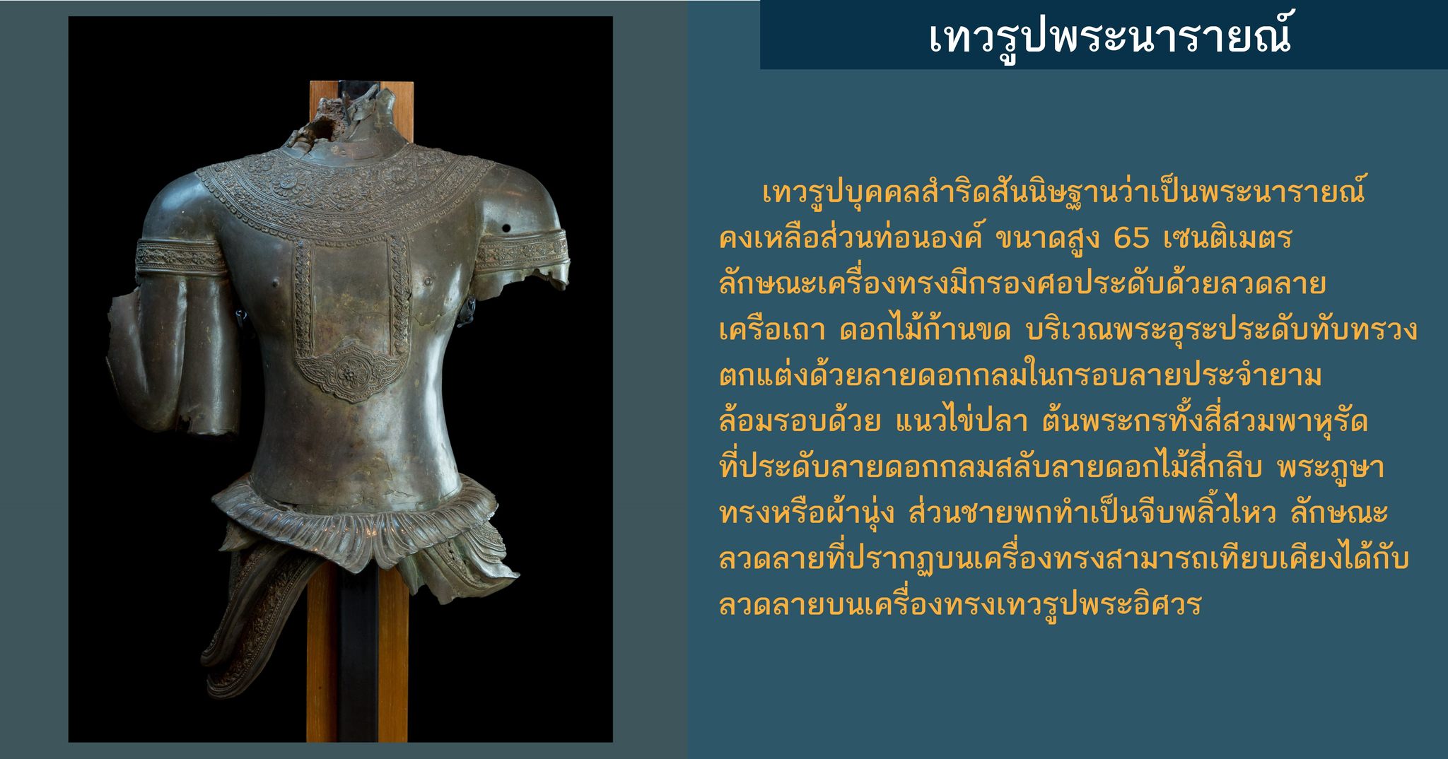 นอกจากนี้ยังพบเทวรูปบุคคลสำริดสันนิษฐานว่าเป็นพระนารายณ์ คงเหลือส่วนท่อนองค์ ขนาดสูง 65 เซนติเมตร ลักษณะเครื่องทรงมีกรองศอประดับด้วยลวดลายเครือเถา ดอกไม้ก้านขด บริเวณพระอุระประดับทับทรวงตกแต่งด้วยลายดอกกลมในกรอบลายประจำยามล้อมรอบด้วยแนวไข่ปลา ต้นพระกรทั้งสี่สวมพาหุรัดที่ประดับลายดอกกลมสลับลายดอกไม้สี่กลีบ พระภูษาทรงหรือผ้านุ่งส่วนชายพกทำเป็นจีบพลิ้วไหว ลักษณะลวดลายที่ปรากฏบนเครื่องทรงสามารถเทียบเคียงได้กับลวดลายบนเครื่องทรงเทวรูปพระอิศวร