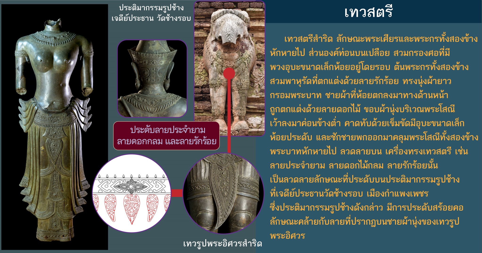 เทวสตรีสำริด ลักษณะพระเศียรและพระกรทั้งสองข้างหักหายไป ส่วนองค์ท่อนบนเปลือย สวมกรองศอที่มีพวงอุบะขนาดเล็กห้อยอยู่โดยรอบ ต้นพระกรทั้งสองข้างสวมพาหุรัดที่ตกแต่งด้วยลายรักร้อย ทรงนุ่งผ้ายาวกรอมพระบาท ชายผ้าที่ห้อยตกลงมาทางด้านหน้าถูกตกแต่งด้วยลายดอกไม้ ขอบผ้านุ่งบริเวณพระโสณีเว้าลงมาค่อนข้างต่ำ คาดทับด้วยเข็มขัดมีอุบะขนาดเล็กห้อยประดับ และชักชายพกออกมาคลุมพระโสณีทั้งสองข้าง พระบาทหักหายไป ลวดลายบนเครื่องทรงเทวสตรี เช่น ลายประจำยาม ลายดอกไม้กลม ลายรักร้อย นั้นเป็นลวดลายลักษณะที่ประดับบนประติมากรรมรูปช้างที่เจดีย์ประธานวัดช้างรอบ เมืองกำแพงเพชร ซึ่งประติมากรรมรูปช้างดังกล่าวมีการประดับสร้อยคอลักษณะคล้ายกับลายที่ปรากฏบนชายผ้านุ่งของเทวรูปพระอิศวร