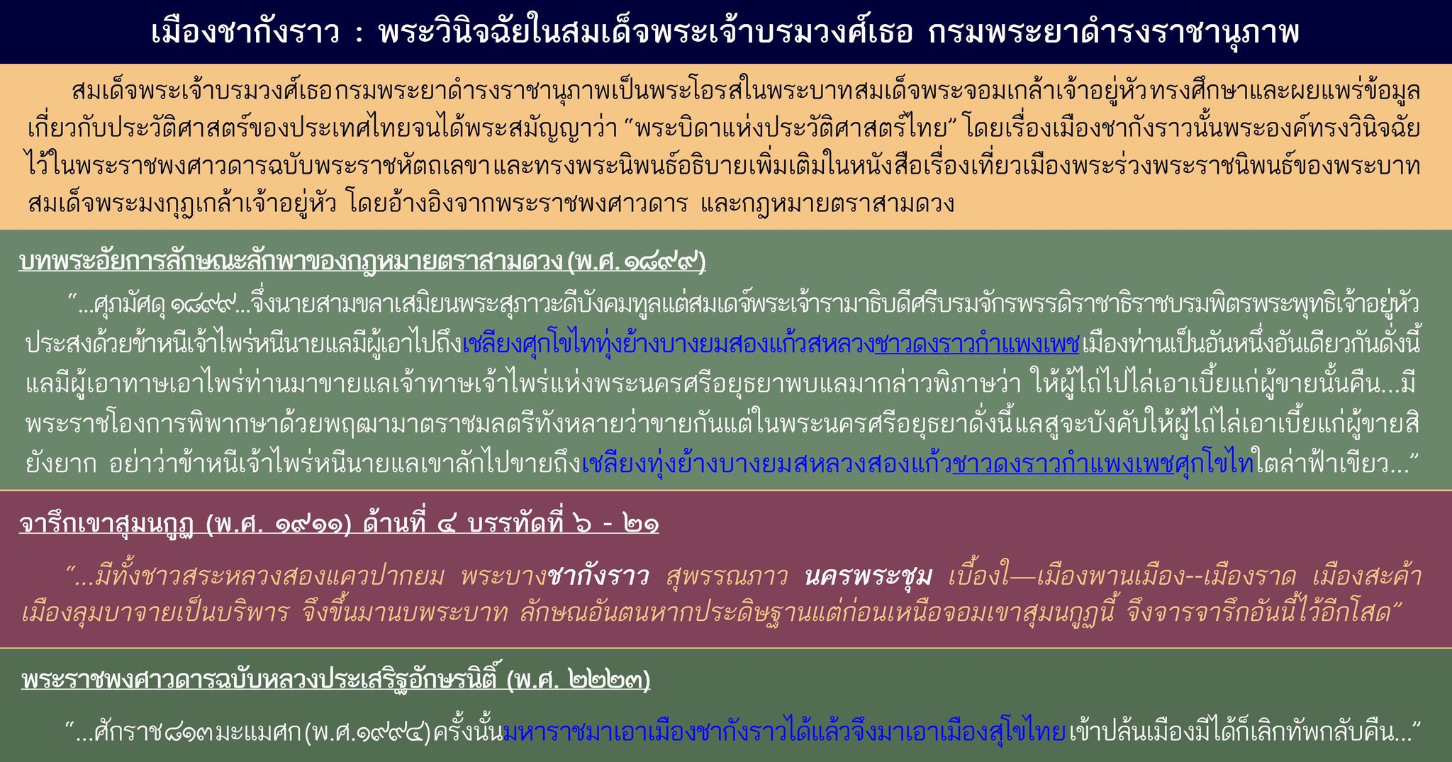 จากพระวินิจฉัยในสมเด็จพระเจ้าบรมวงศ์เธอ กรมพระยาดำรงราชานุภาพ หากพิจารณาลำดับชื่อเมืองที่ถูกอ้างถึงจำนวนสองครั้งในเนื้อความบทพระอัยการลักษณะลักพาของกฎหมายตราสามดวง ไม่ได้ปรากฏการเรียงลำดับแบบเดียวกันทั้งสองครั้ง แสดงให้เห็นว่า ชื่อ “ชากังราว” ที่อยู่ติดกับคำว่า “กำแพงเพชร” นั้น ไม่สามารถระบุได้แน่ชัดถึงการเป็นเมืองที่อยู่ใกล้กัน หรือเป็นชื่อเมืองเดียวกันแต่อย่างใด นอกจากนี้อาจเป็นเพียงการสื่อถึงกลุ่มเมืองในการปกครองของอาณาจักรสุโขทัยอันห่างไกลจากอาณาจักรอยุธยา ส่วนเหตุการณ์สมัยพระบรมไตรนาถที่กล่าวถึงพระเจ้าติโลกราชแห่งล้านนามาตีเมืองชากังราวก่อนตีเมืองสุโขทัยในพระราชพงศาวดารฉบับหลวงประเสริฐอักษรนิติ์นั้น อนุมานได้ว่าเมืองชากังราวอยู่ใกล้ล้านนามากกว่าเมืองสุโขทัย อีกทั้งข้อความในศิลาจารึกเขาสุมนกูฏ ก็ปรากฏชื่อเมืองชากังราว และเมืองนครชุมในสมัยเดียวกัน จึงไม่อาจกล่าวได้ว่าเมืองทั้งสองเป็นเมืองเดียวกัน