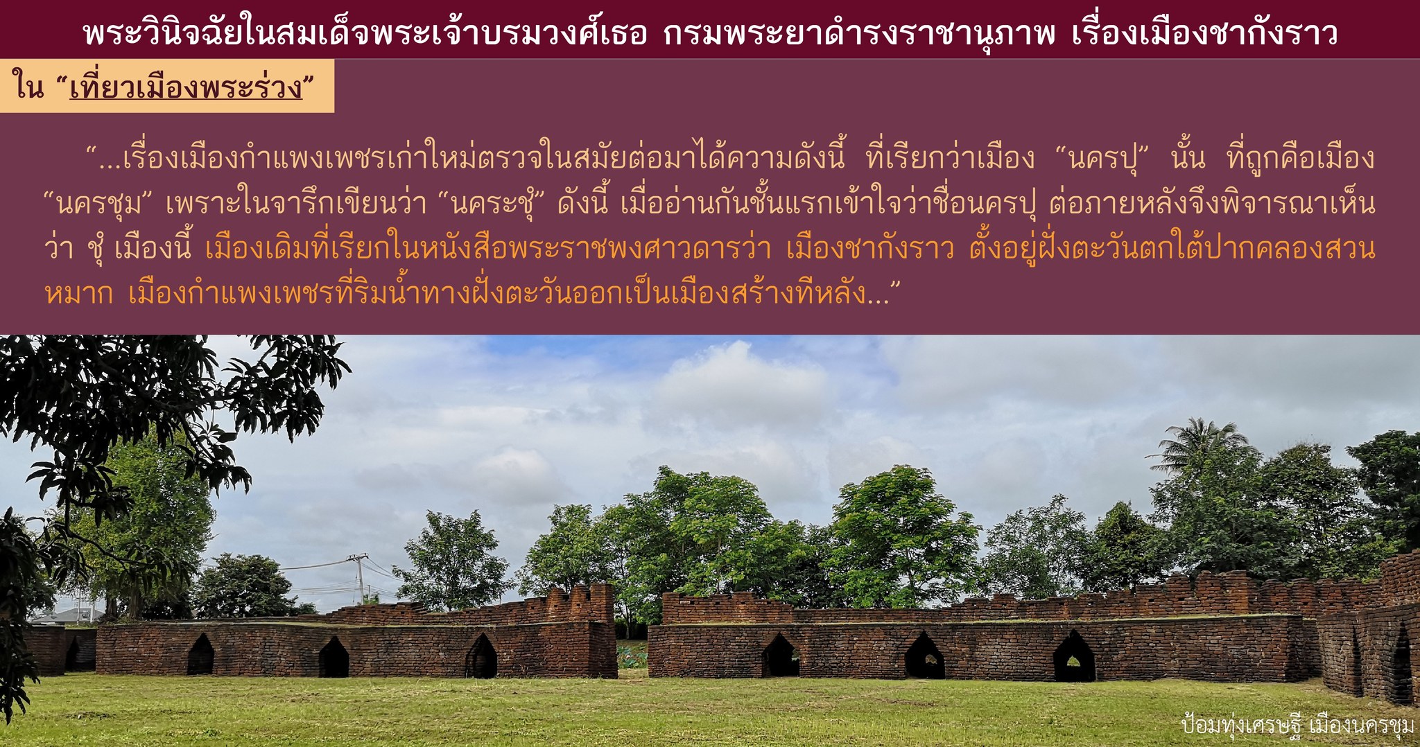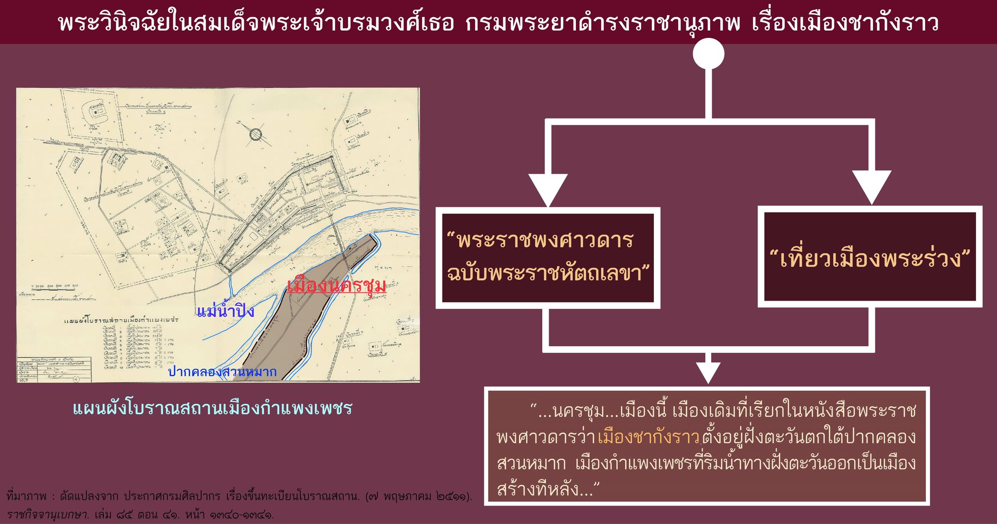 “...เรื่องเมืองกำแพงเพชรเก่าใหม่ตรวจในสมัยต่อมาได้ความดังนี้ ที่เรียกว่าเมือง “นครปุ” นั้น ที่ถูกคือเมือง “นครชุม” เพราะในจารึกเขียนว่า “นคระชุํ” ดังนี้ เมื่ออ่านกันชั้นแรกเข้าใจว่าชื่อนครปุ ต่อภายหลังจึงพิจารณาเห็นว่า ชุํเมืองนี้ เมืองเดิมที่เรียกในหนังสือพระราชพงศาวดารว่า เมืองชากังราว ตั้งอยู่ฝั่งตะวันตกใต้ปากคลองสวนหมาก เมืองกำแพงเพชรที่ริมน้ำทางฝั่งตะวันออกเป็นเมืองสร้างทีหลัง...”