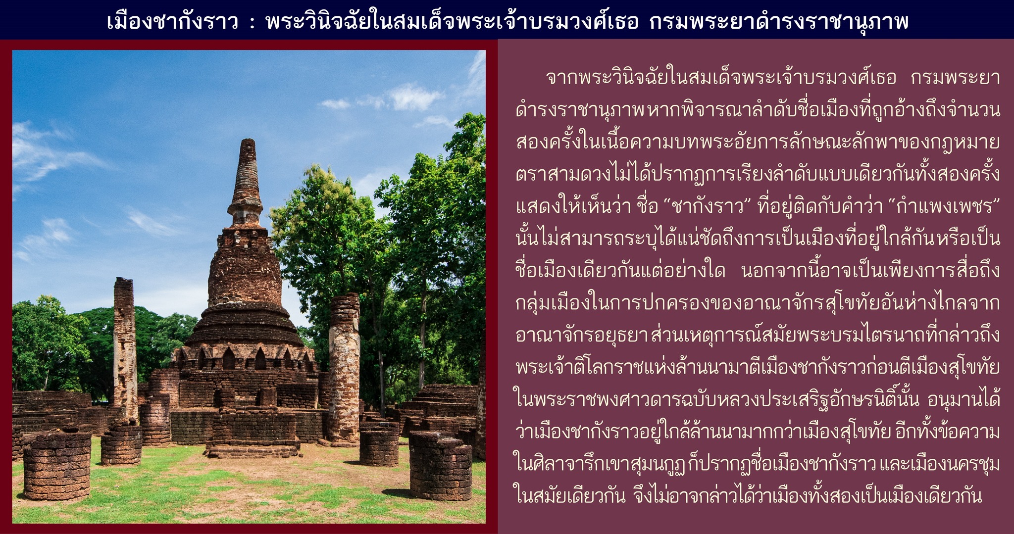 สมเด็จพระเจ้าบรมวงศ์เธอ กรมพระยาดำรงราชานุภาพเป็นพระโอรสในพระบาทสมเด็จพระจอมเกล้าเจ้าอยู่หัว ทรงศึกษาและผยแพร่ข้อมูลเกี่ยวกับประวัติศาสตร์ของประเทศไทยจนได้พระสมัญญาว่า “พระบิดาแห่งประวัติศาสตร์ไทย” โดยเรื่องเมืองชากังราวนั้นพระองค์ทรงวินิจฉัยไว้ในพระราชพงศาวดารฉบับพระราชหัตถเลขา และทรงพระนิพนธ์อธิบายเพิ่มเติมในหนังสือเรื่องเที่ยวเมืองพระร่วงพระราชนิพนธ์ในพระบาทสมเด็จพระมงกุฎเกล้าเจ้าอยู่หัว โดยอ้างอิงจากพระราชพงศาวดาร และกฎหมายตราสามดวงว่า เมืองชากังราวเป็นเมืองเดิมของเมืองนครชุมซึ่งตั้งอยู่ทางด้านตะวันตกของแม่น้ำปิง ใต้ปากคลองสวนหมาก จังหวัดกำแพงเพชร
