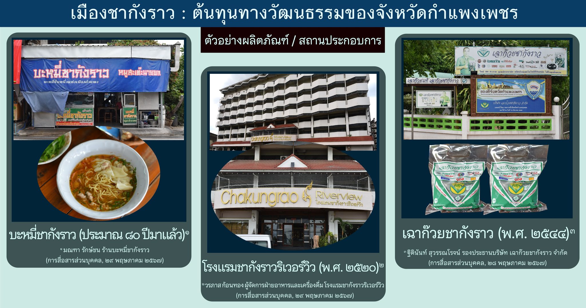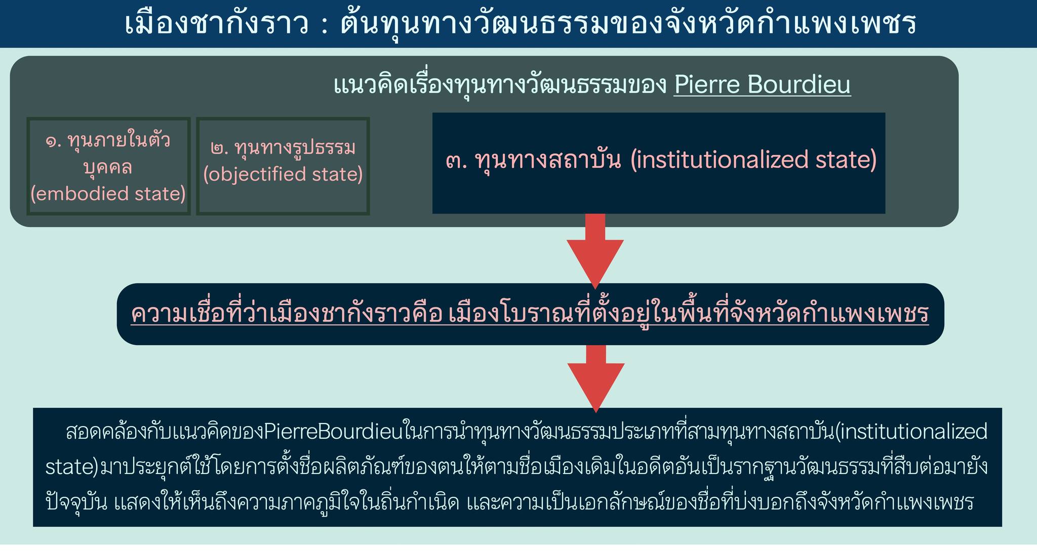 จากความเชื่อที่แพร่หลายและความภาคภูมิใจว่าเมืองชากังราวคือเมืองโบราณที่ตั้งอยู่ในพื้นที่จังหวัดกำแพงเพชรนั้น ทำให้ประชาชนในจังหวัดกำแพงเพชรนำทุนทางวัฒนธรรมนี้มาเพิ่มมูลค่าแก่ผลิตภัณฑ์เพื่อการบริการในท้องถิ่น สอดคล้องกับแนวคิดของ Pierre Bourdieu ในการนำทุนทางวัฒนธรรมประเภทที่สามทุนทางสถาบัน (institutionalized state) มาประยุกต์ใช้ โดยการตั้งชื่อผลิตภัณฑ์ของตนให้ตามชื่อเมืองเดิมในอดีตอันเป็นรากฐานวัฒนธรรมที่สืบต่อมายังปัจจุบัน แสดงให้เห็นถึงความภาคภูมิใจในถิ่นกำเนิด และความเป็นเอกลักษณ์ของชื่อที่บ่งบอกถึงจังหวัดกำแพงเพชร อาทิเช่น บะหมี่ชากังราว (ประมาณ ๘๐ ปีมาแล้ว ) เฉาก๊วยชากังราว (พ.ศ. ๒๕๔๔ ) สถานประกอบการ เช่น โรงแรมชากังราวริเวอร์วิว (พ.ศ. ๒๕๒๐ ) รวมถึงการประชาสัมพันธ์กิจกรรมเพื่อส่งเสริมการท่องเที่ยวของจังหวัดกำแพงเพชร เช่น การแข่งขันกีฬาแห่งชาติ ภาค ๕ ครั้งที่ ๔๐ “ชากังราวเกมส์” ระหว่างวันที่ ๑๙ - ๒๙ กรกฎาคม ๒๕๕๔ เป็นต้น