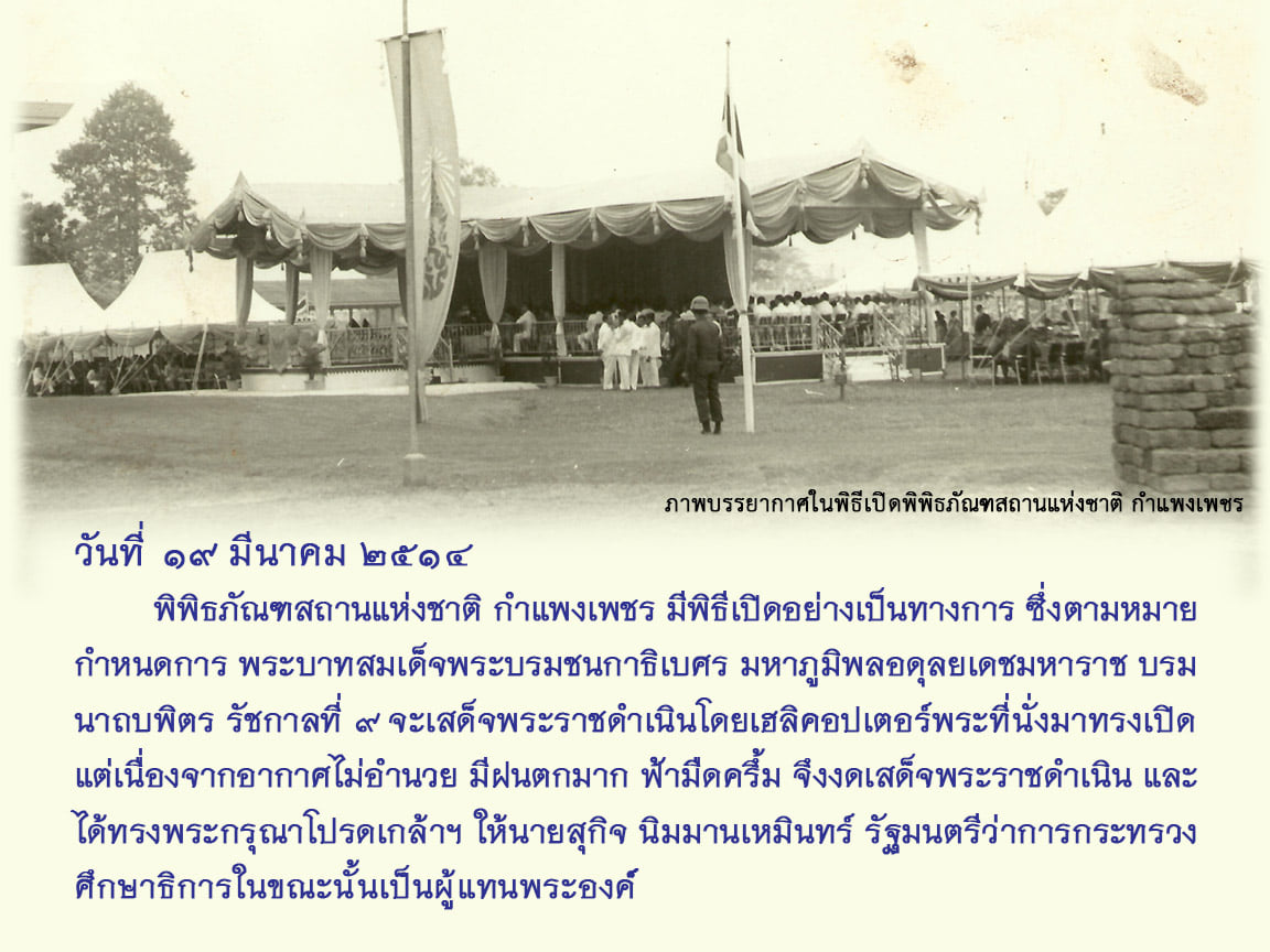 พิพิธภัณฑสถานแห่งชาติ กำแพงเพชร ชวนทุกท่านย้อนอดีตกลับไปเมื่อวันที่ ๑๙ มีนาคม ๒๕๑๔ ซึ่งเป็นวันเปิดพิพิธภัณฑสถานแห่งชาติ กำแพงเพชร อย่างเป็นทางการ นายประพัฒน์ ตรีณรงค์ ได้บันทึกรายละเอียดเหตุการณ์พิธีเปิด สรุปได้ดังนี้