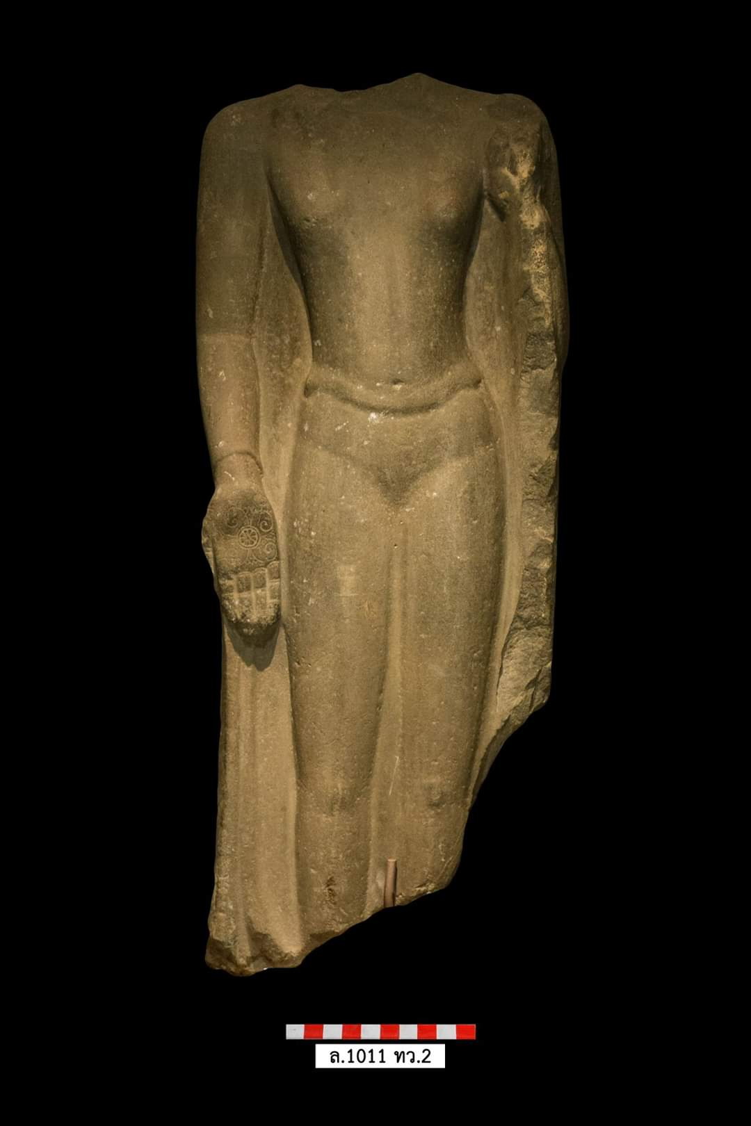 ต่อมาวัฒนธรรมทวารวดีได้รับรูปแบบและพัฒนาให้มีความเป็นพื้นเมืองมากขึ้น เช่น พระพุทธรูปที่จัดแสดงองค์นี้ ที่ประทับยืนหย่อนพระชานุเอียงตัวเล็กน้อย พระเศียร พระหัตถ์ซ้าย และพระบาทหักหายไป พระกรขวาวางเหยียดลงข้างพระวรกาย หงายฝ่าพระหัตถ์ออกด้านหน้า กลางฝ่าพระหัตถ์มีลวดลายธรรมจักร ครองจีวรห่มคลุมเรียบและบางแนบพระวรกาย