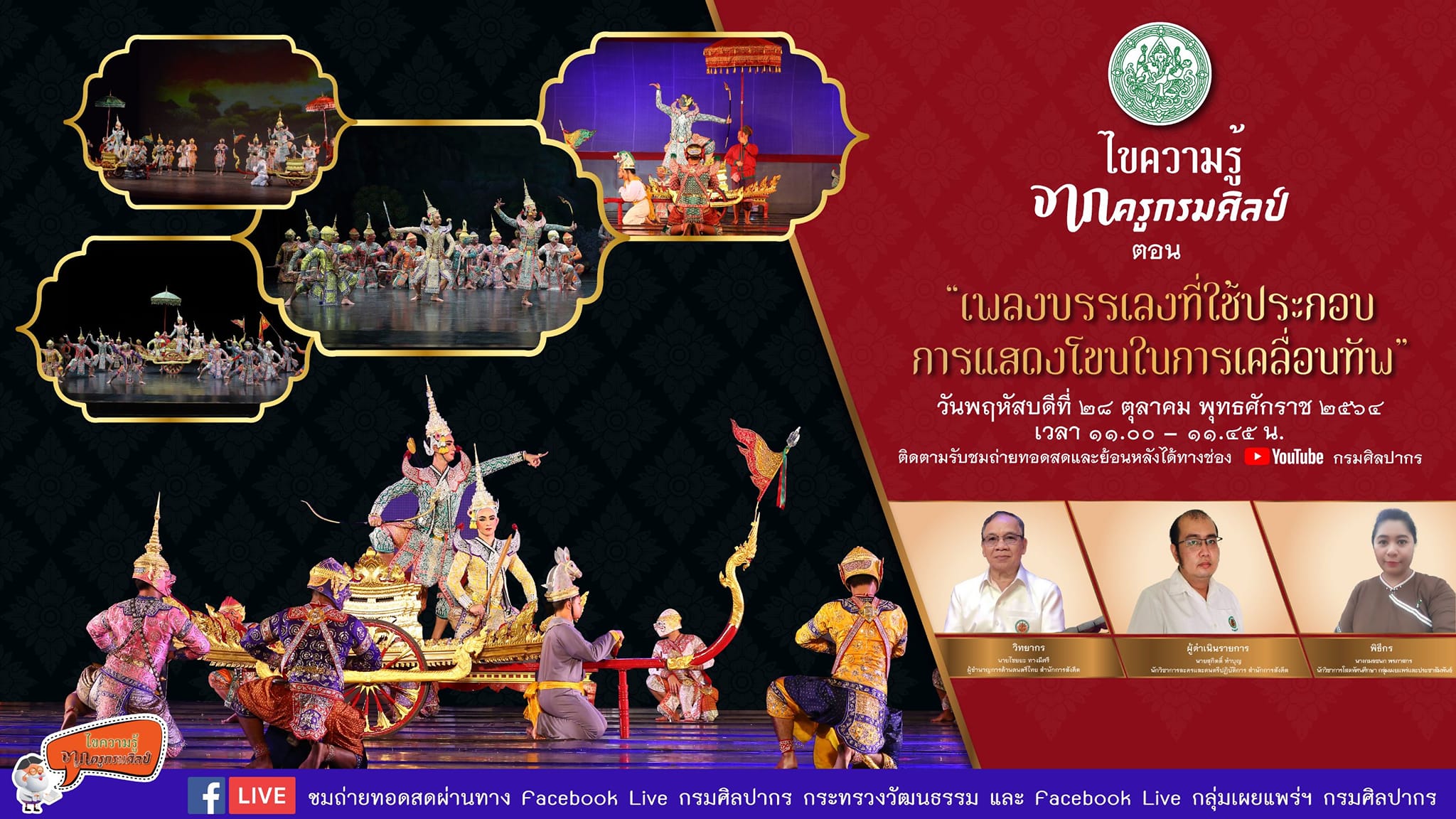 ขอเชิญรับชมถ่ายทอดสด Facebook Live รายการ ไขความรู้จากครูกรมศิลป์ ตอน “เพลงบรรเลงที่ใช้ประกอบการแสดงโขนในการเคลื่อนทัพ” ในวันพฤหัสบดีที่ ๒๘ ตุลาคม ๒๕๖๔ เวลา ๑๑.๐๐ – ๑๑.๔๕ น.