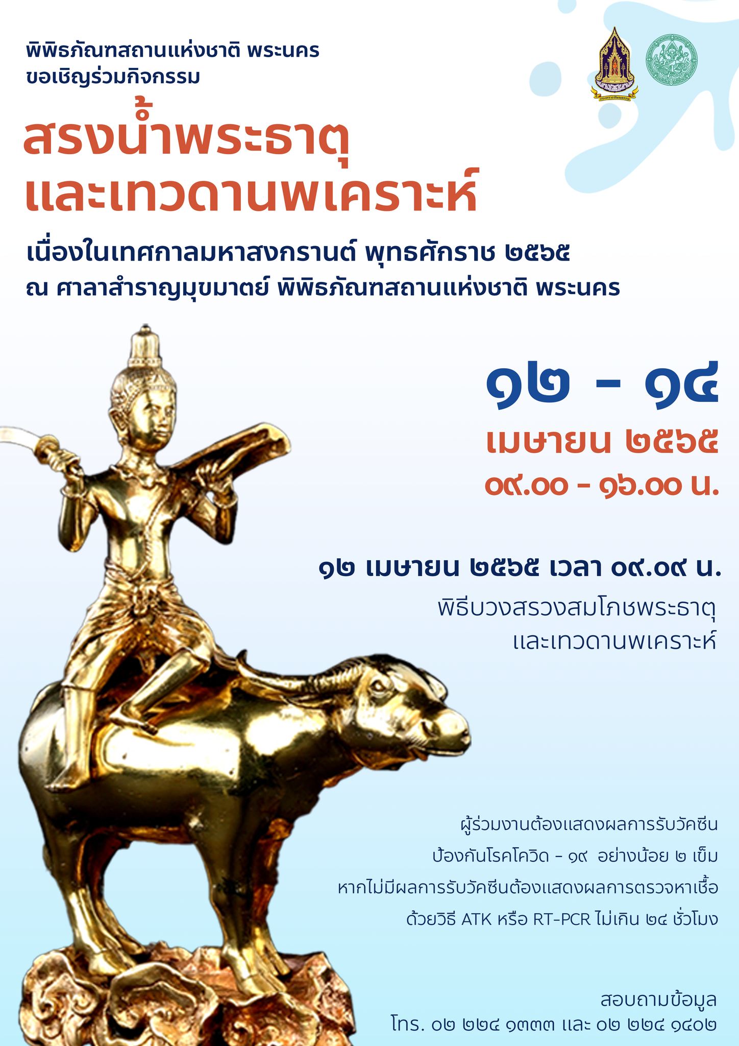 กรมศิลปากร ขอเชิญพุทธศาสนิกชนและผู้สนใจร่วมกิจกรรมสรงน้ำพระธาตุและเทวดานพเคราะห์ เนื่องในเทศกาลสงกรานต์ ประจำปี ๒๕๖๕ ระหว่างวันที่ ๑๒ – ๑๔ เมษายน ๒๕๖๕ เวลา ๐๙.๐๐ – ๑๖.๐๐ น. ณ ศาลาสำราญมุขมาตย์ พิพิธภัณฑสถานแห่งชาติ พระนคร