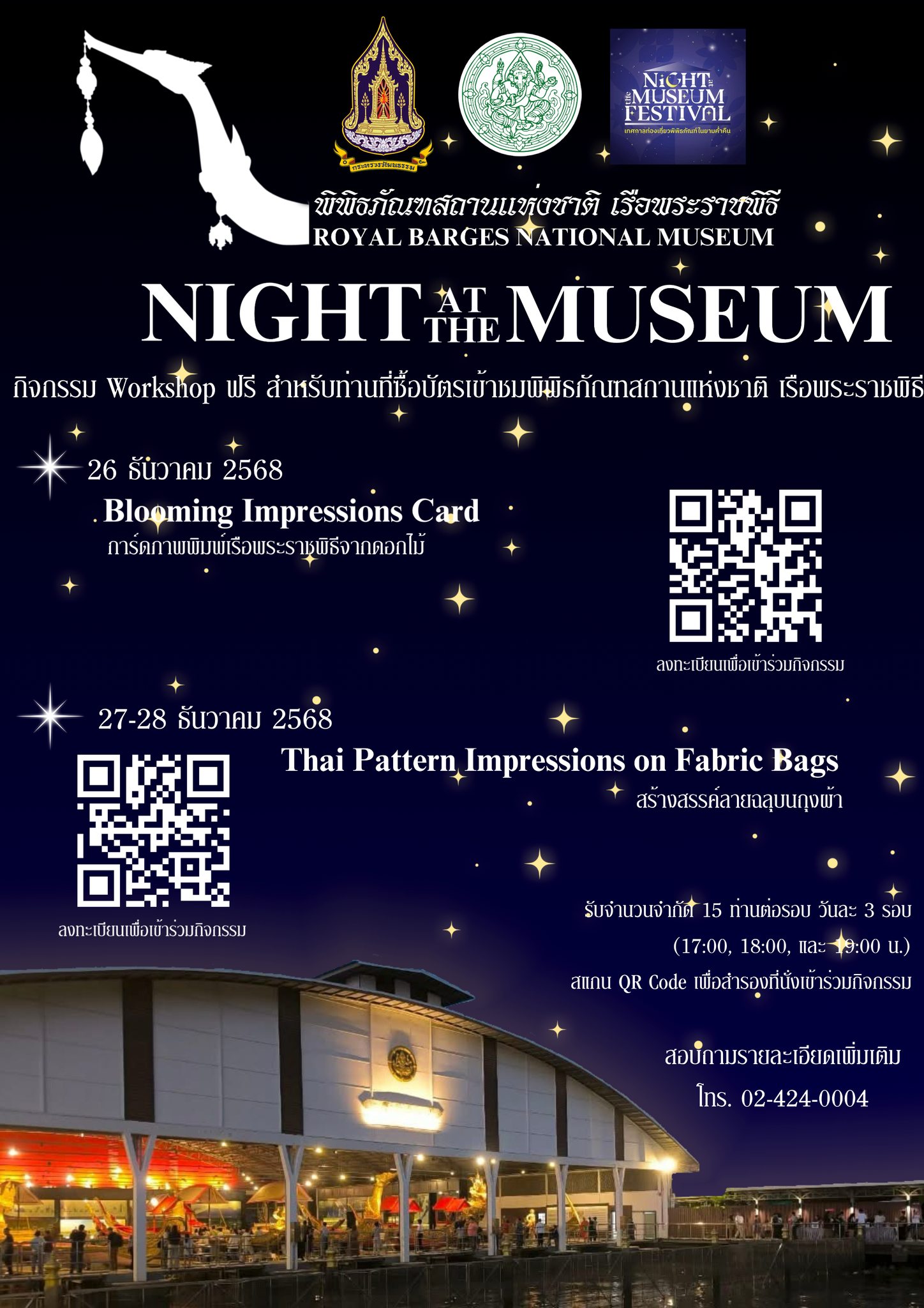 * Special activities, including workshops such as Queen Sirikit Flower Craft, sculpture painting, DIY cloth bags and keychains, a Museum Market, and a musical performance by the Office of Performing Arts.