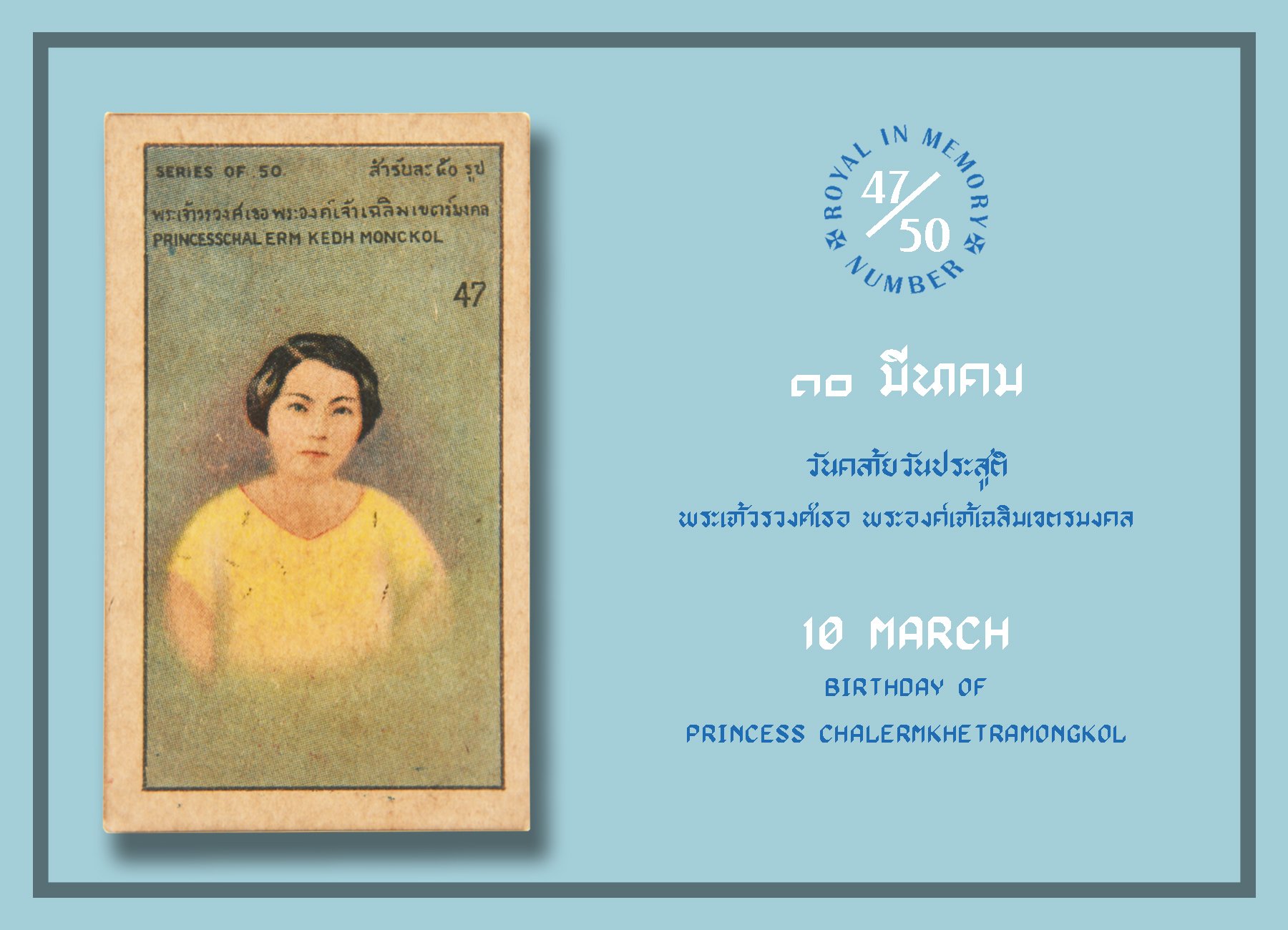 Cigarette Cards ชุดเจ้านายไทย (๑ สำรับ ประกอบด้วย พระบรมฉายาสาทิสลักษณ์ พระฉายาสาทิสลักษณ์ และรูปเขียนคล้ายพระรูปพระบรมวงศานุวงศ์บนแผ่นกระดาษ จำนวน ๕๐ รูป) ลำดับที่ ๔๗ โดยบริษัท ยาสูบซำมุ้ย จำกัด (SUMMUYE & CO) ผลิตราวปี พ.ศ. ๒๔๗๗ (หมายเลขทะเบียน ๒/๒๕๑๖/๑) มีประวัติระบุว่า คุณหลวงฉมาชำนิเขต มอบให้เมื่อวันที่ ๙ มกราคม ๒๕๑๖
