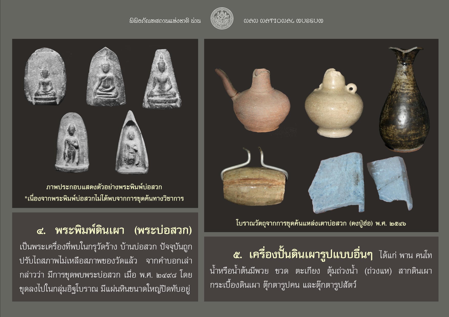 ปัจจุบันโบราณวัตถุจากแหล่งเตาบ่อสวก ได้มีการจัดแสดงให้เข้าชม