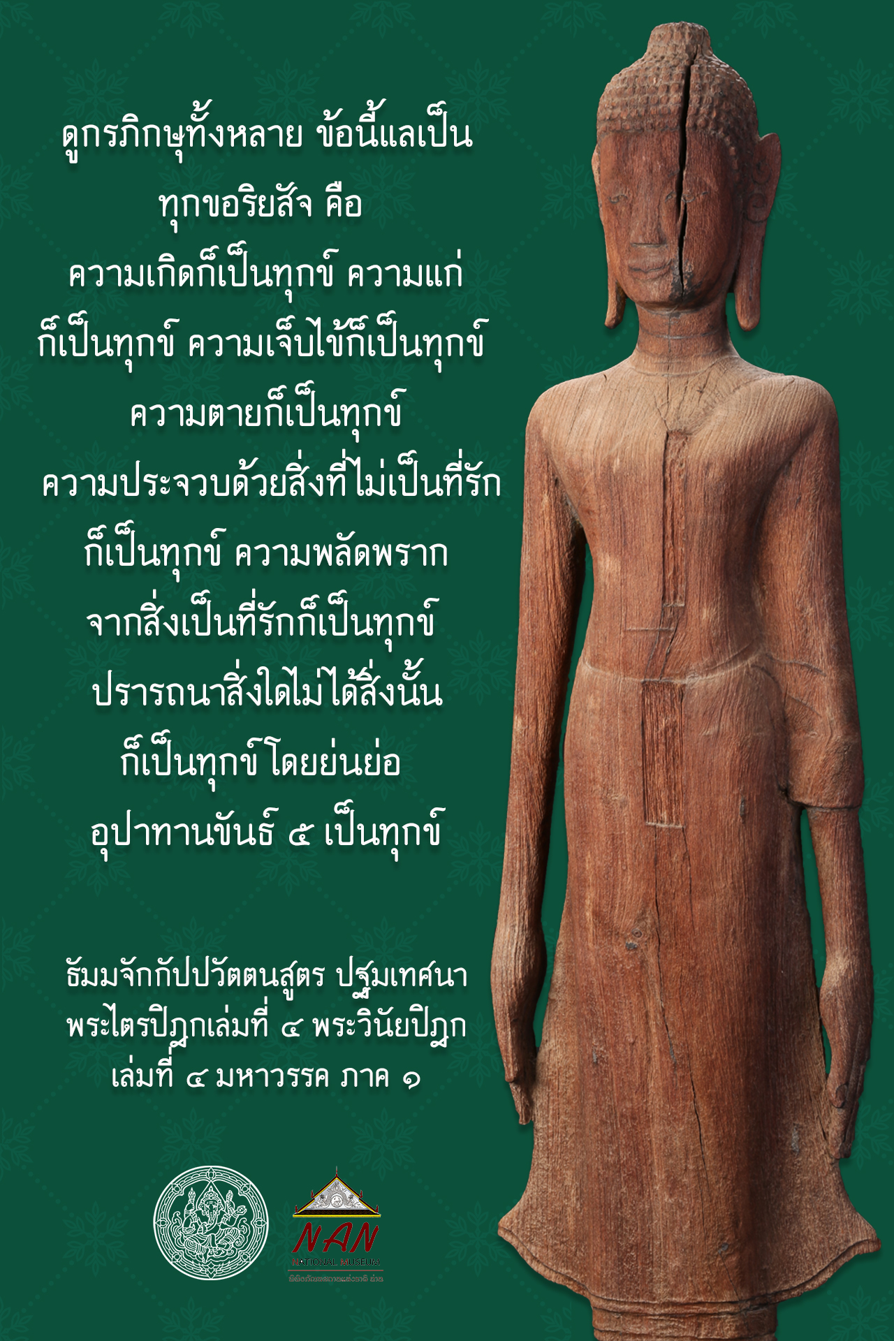 ดูกรภิกษุทั้งหลาย ข้อนี้แลเป็นทุกขอริยสัจ คือ ความเกิดก็เป็นทุกข์ ความแก่ก็เป็นทุกข์ ความเจ็บไข้ก็เป็นทุกข์ ความตายก็เป็นทุกข์ ความประจวบด้วยสิ่งที่ไม่เป็นที่รักก็เป็นทุกข์ ความพลัดพรากจากสิ่งเป็นที่รักก็เป็นทุกข์ ปรารถนาสิ่งใดไม่ได้สิ่งนั้นก็เป็นทุกข์โดยย่นย่อ อุปาทานขันธ์ ๕ เป็นทุกข์