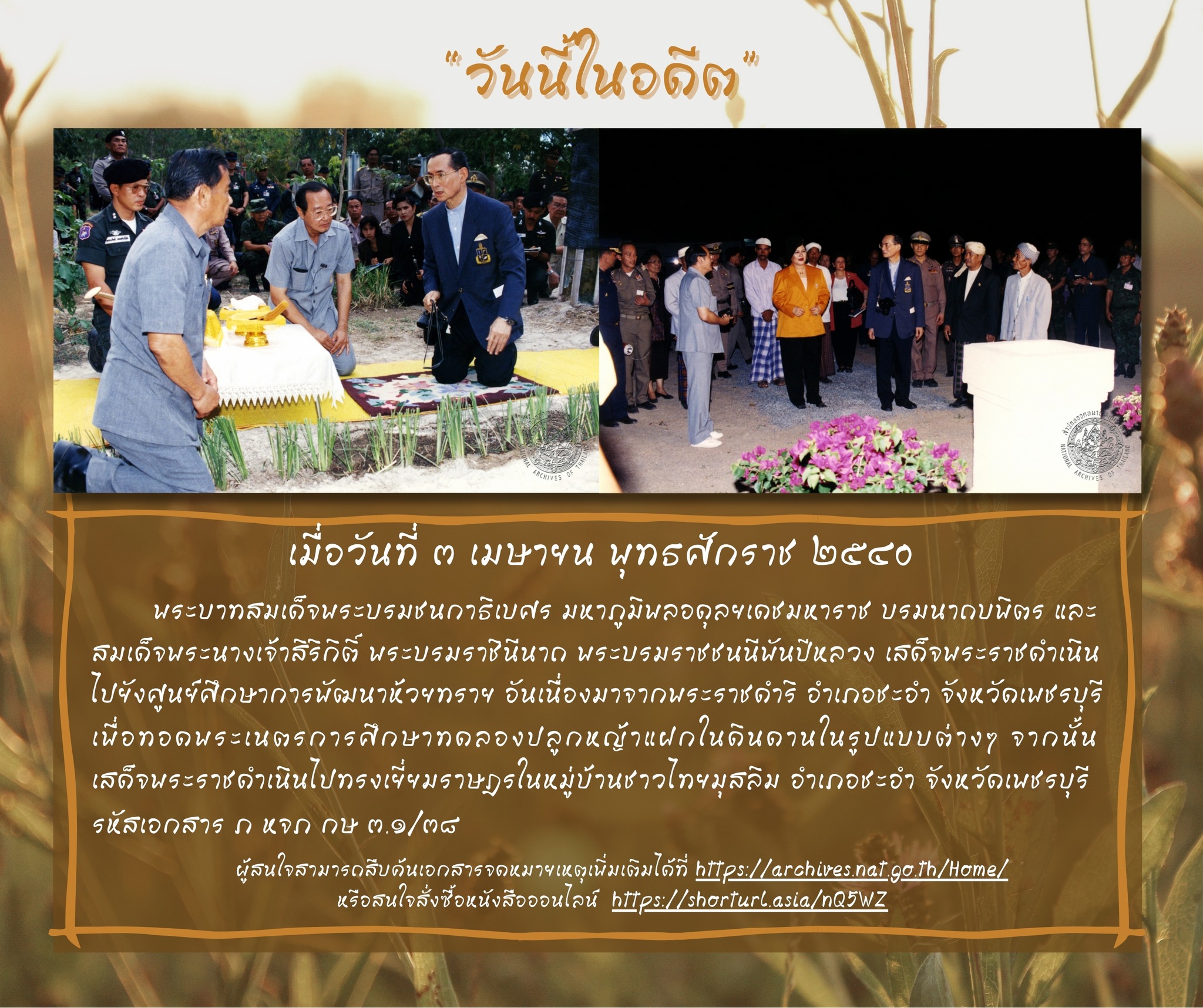 พระบาทสมเด็จพระบรมชนกาธิเบศร มหาภูมิพลอดุ ลยเดชมหาราช บรมนาถบพิตร และสมเด็จพระนางเจ้าสิริกิติ์ พระบรมราชินีนาถ พระบรมราชชนนีพันปีหลวง เสด็จพระราชดำเนินไปยังศูนย์ศึกษาการพัฒนาห้วยทราย อันเนื่องมาจากพระราชดำริ อำเภอชะอำ จังหวัดเพชรบุรี เพื่อทอดพระเนตรการศึกษาทดลองปลูกหญ้าแฝกในดินดานในรูปแบบต่าง ๆ จากนั้นเสด็จพระราชดำเนินไปทรงเยี่ยมราษฎรในหมู่บ้านชาวไทยมุสลิม อำเภอชะอำ จังหวัดเพชรบุรี