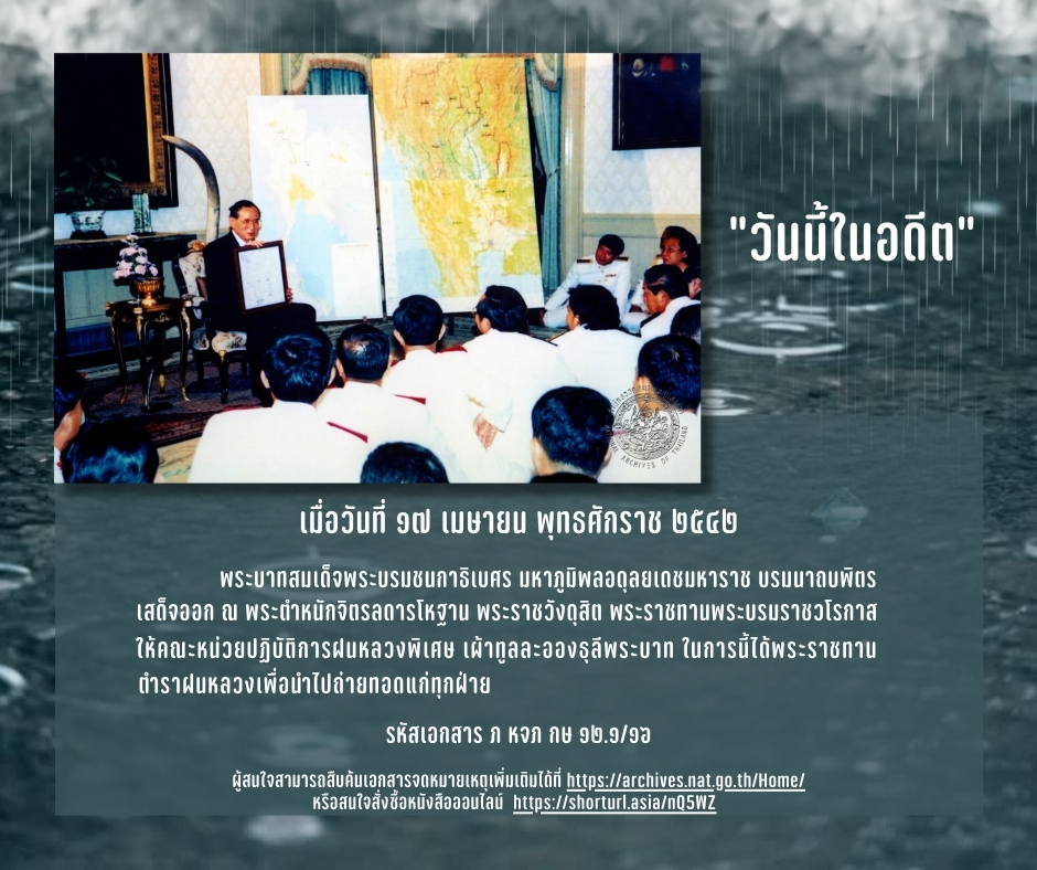 พระบาทสมเด็จพระบรมชนกาธิเบศร มหาภูมิพลอดุลยเดชมหาราช บรมนาถบพิตร เสด็จออก ณ พระตำหนักจิตรลดารโหฐาน พระราชวังดุสิต พระราชทานพระบรมราชวโรกาสให้คณะหน่วยปฏิบัติการฝนหลวงพิเศษ เฝ้าทูลละอองธุลีพระบาท ในการนี้ได้พระราชทานตำราฝนหลวง เพื่อนำไปถ่ายทอดแก่ทุกฝ่าย