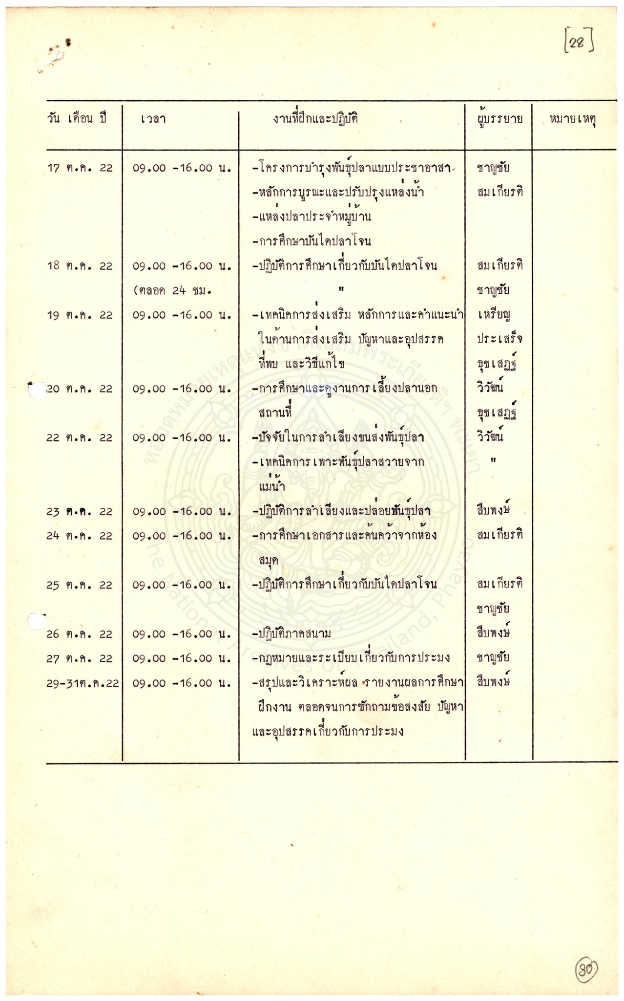 5. ช่วงสุดท้ายของการฝึกงานมีการบรรยายกฎหมายกับระเบียบการประมงให้ทราบ ตลอดจนสรุปปัญหา ตอบข้อสงสัยต่างๆ และจัดทำรายงานผลการศึกษา