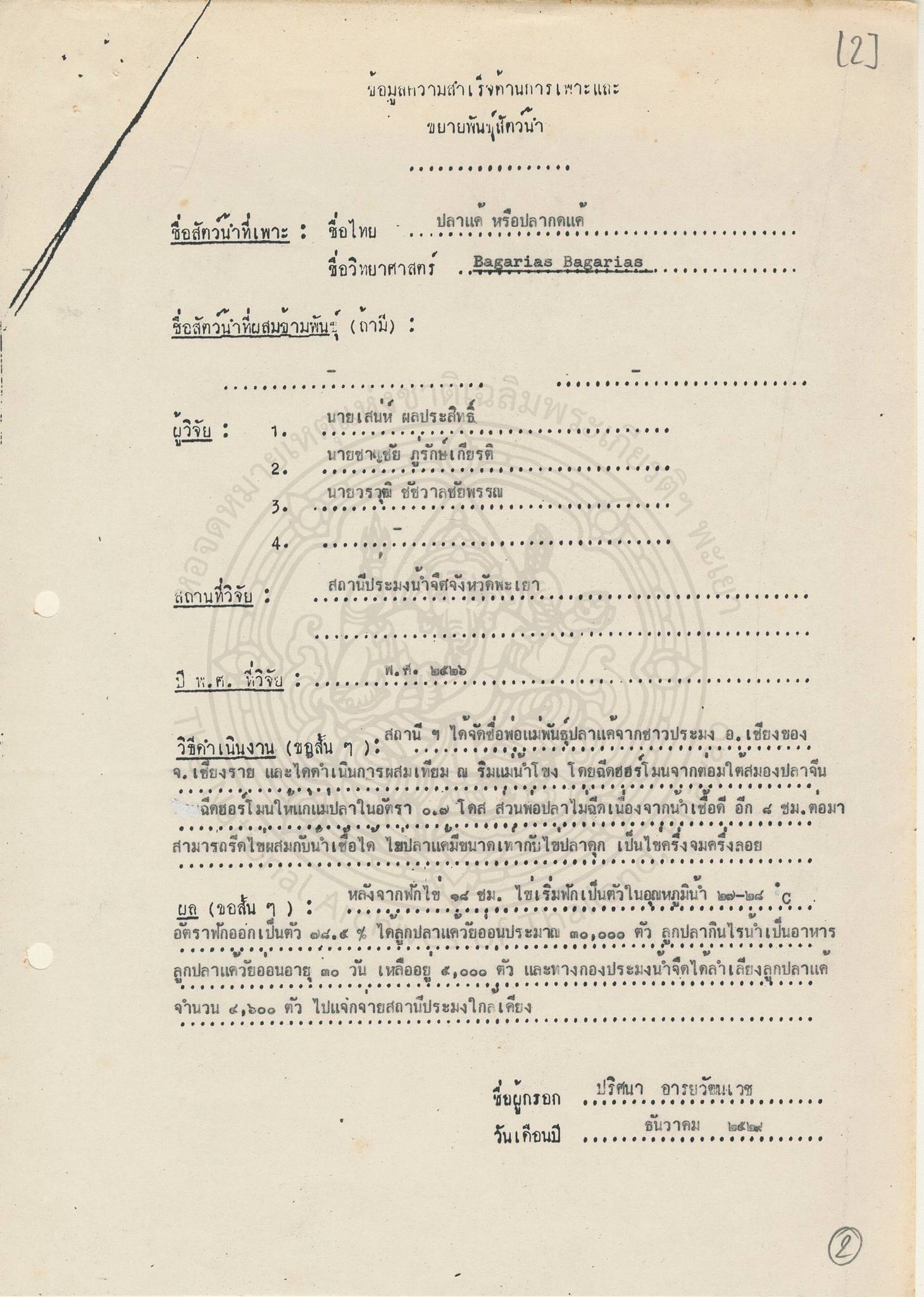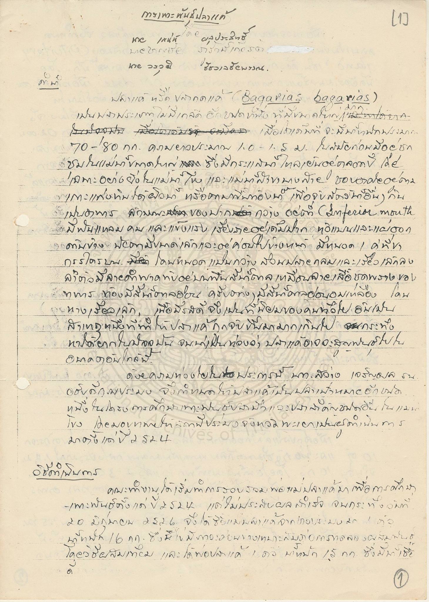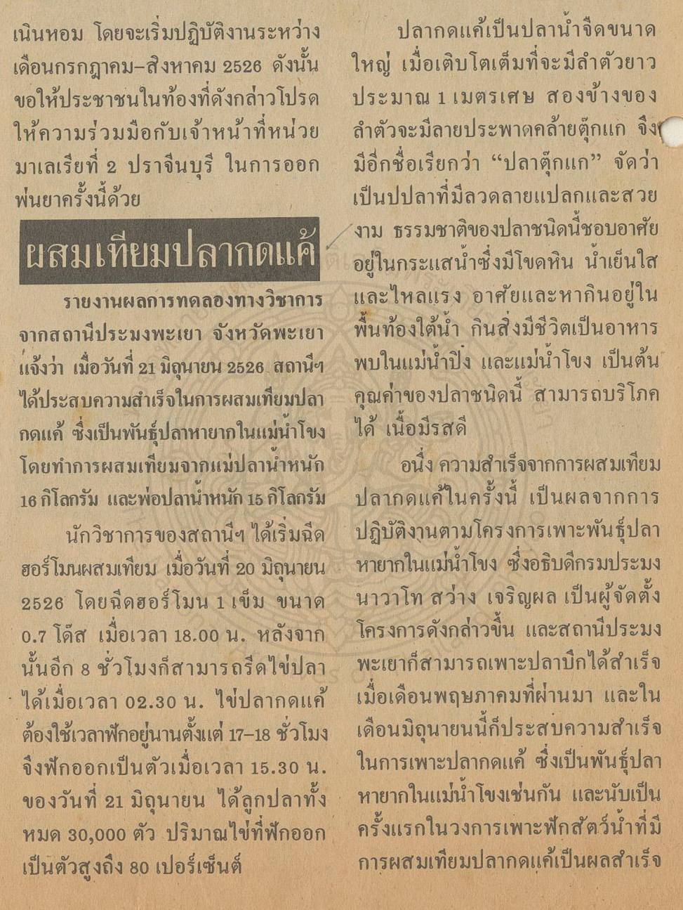 -- องค์ความรู้จากเอกสารจดหมายเหตุ : ผสมเทียมปลาแค้ครั้งแรก --