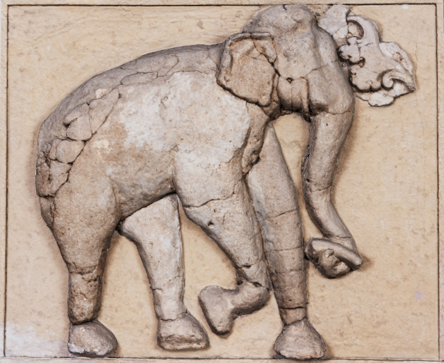 เดิมประดับที่ฐานลานประทักษิณด้านทิศตะวันออกเฉียงใต้ ของเจดีย์จุลประโทน อ.เมืองนครปฐม จ.นครปฐม ได้จากการขุดค้นทางโบราณคดี เมื่อ พ.ศ.๒๕๑๑ ภาพเล่าเรื่องษัฑทันตะ (ฉัททันต์) จากคัมภัร์สูตราลังการ เล่าเรื่อง เมื่อพระโพธิสัตว์เสวยพระชาติเป็นพระยาช้างมี ๖ งา มีพระราชินีซึ่งโกรธเคืองพระยาช้างมาแต่ชาติปางก่อน สั่งให้นายพรานไปนำงามาให้แก่ตน พรานจึงปลอมตัวเป็นพระภิกษุและยิงพระยาช้างด้วยลูกดอกอาบยาพิษ ด้วยนายพรานอยู่ในผ้ากาสาวพัสตร์ พระโพธิสัตว์จึงมิได้ทำอันตราย และอนุญาตให้นำงาของตนไปได้ โดนเอางวงของตนถอดงามอบให้แก่นายพราน