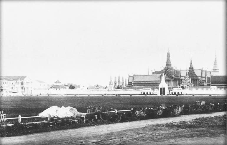 ภาพ : ภาพท้องสนามหลวง ฝั่งทิศใต้มองเห็นพระบรมมหาราชวัง ด้านนี้คือบริเวณที่ประกอบพิธีแรกนาสมัยต้นรัตนโกสินทร์ โปรดดูรายละเอียดเพิ่มเติมในหนังสือ พระราชพิธีสิบสอง