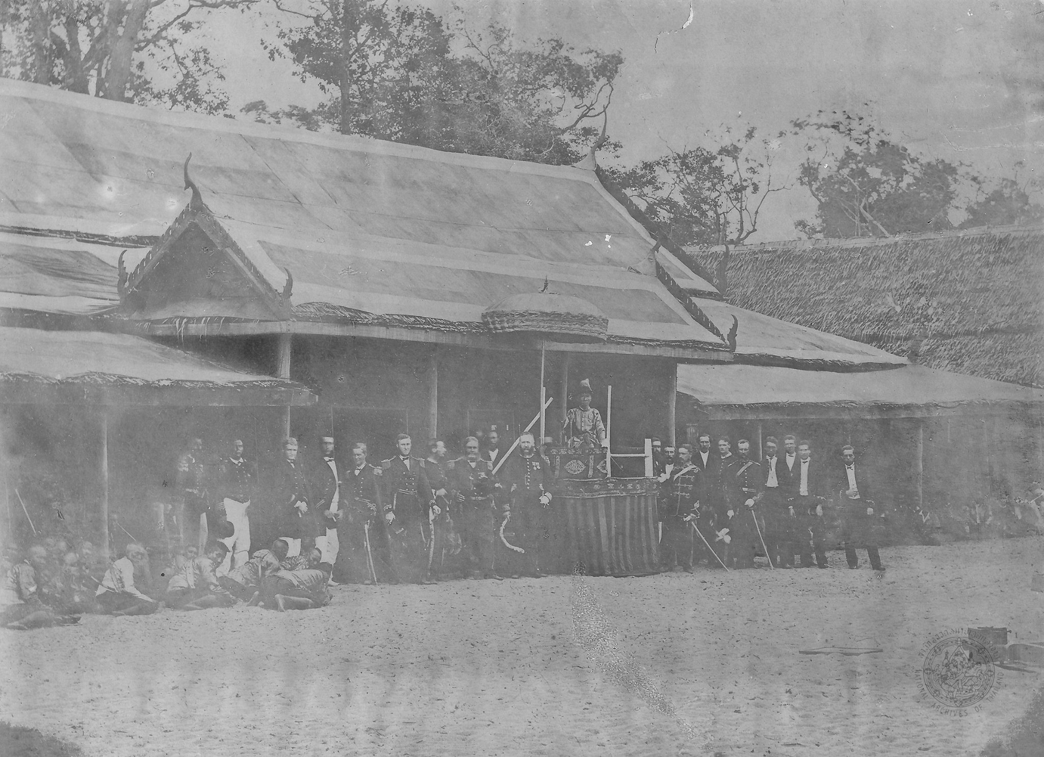 ภาพ : พระบาทสมเด็จพระจอมเกล้าเจ้าอยู่หัว พระสยามเทวมหามกุฏวิทยมหาราช เสด็จพระราชดำเนินทอดพระเนตรสุริยุปราคาที่บ้านหว้ากอ เมืองประจวบคีรีขันธ์ ประทับ ณ เกยหน้าพลับพลาที่ประทับ โปรดให้ฉายพระรูปกับคณะแขกเมือง ณ ค่ายหลวงบ้านหว้ากอ