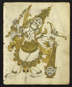ภาพที่ 1. ตำราภาพเทวรูป ฉบับหอสมุดแห่งชาติ เลขที่ 32 ภาพนารายณ์อวตาร ปางอัปสราวตาร ตามคติทางไสยศาสตร์อย่างไทย พระนารายณ์แสดงลักษณะของพระศิวะ เทพผู้ทำลาย โดยสวมมุณฑมาลาหรือพวงมาลัยหัวกะโหลก ไม่นิยมแสดงความรุนแรง สยดสยอง อย่างศิลปะอินเดีย ซึ่งเป็นต้นแบบ