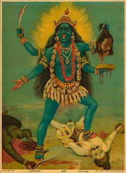 ภาพที่ 3. ภาพพิมพ์รูปพระแม่กาลี อายุคริสต์ศตวรรษที่ 20 ผลิตโดยสำนักพิมพ์ Ravi Varma ของอินเดีย มีการแสดงออกอย่างรุนแรงเสมือนจริง ภาพจาก The Metropolitan Museum of Art