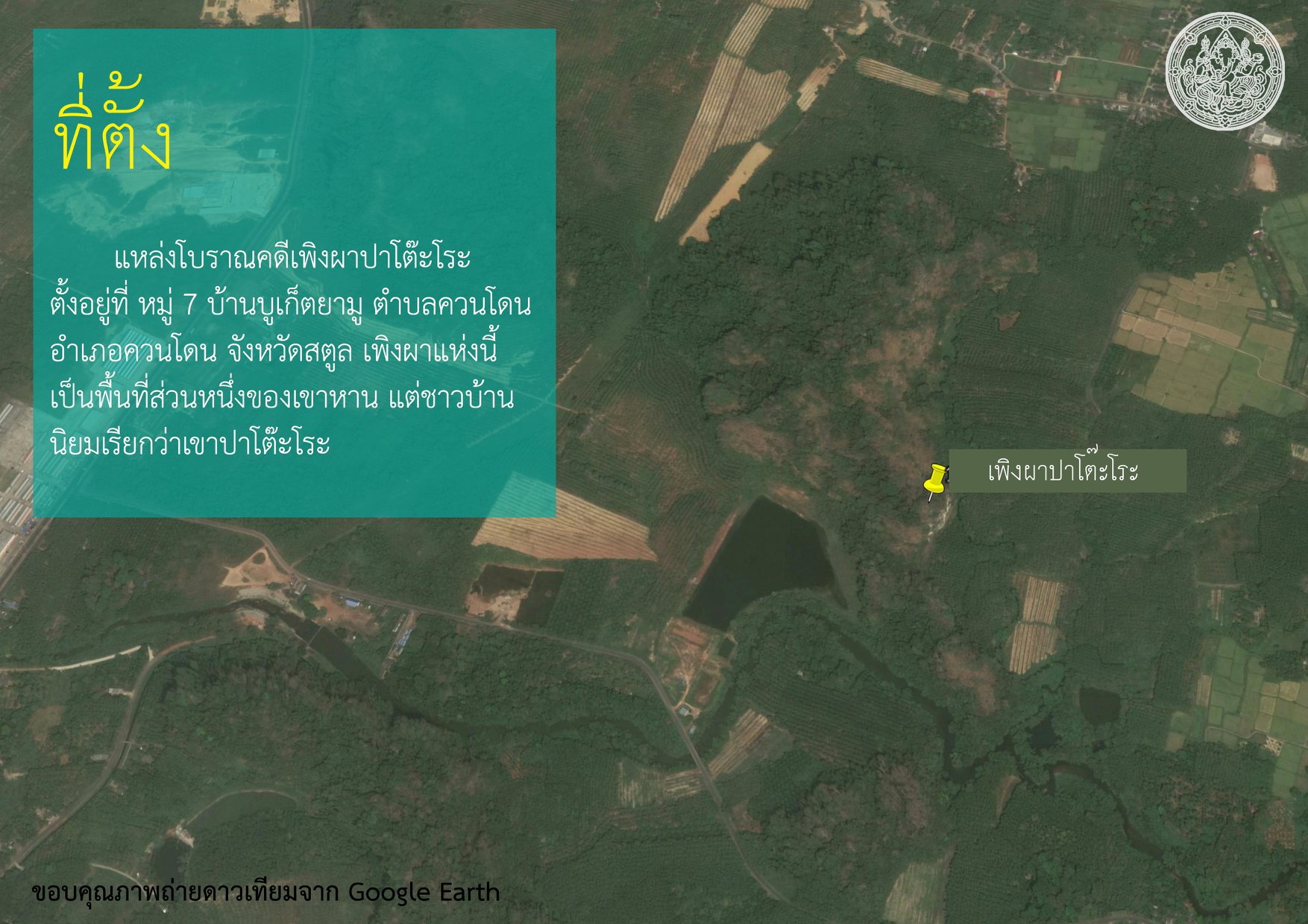 แหล่งโบราณคดีเพิงผาปาโต๊ะโระ ตั้งอยู่ที่ หมู่ ๗ บ้านบูเก็ตยามู ตำบลควนโดน อำเภอควนโดน จังหวัดสตูล เพิงผาแห่งนี้เป็นพื้นที่ส่วนหนึ่งของเขาหาน แต่ชาวบ้านนิยมเรียกว่าเขาปาโต๊ะโระ