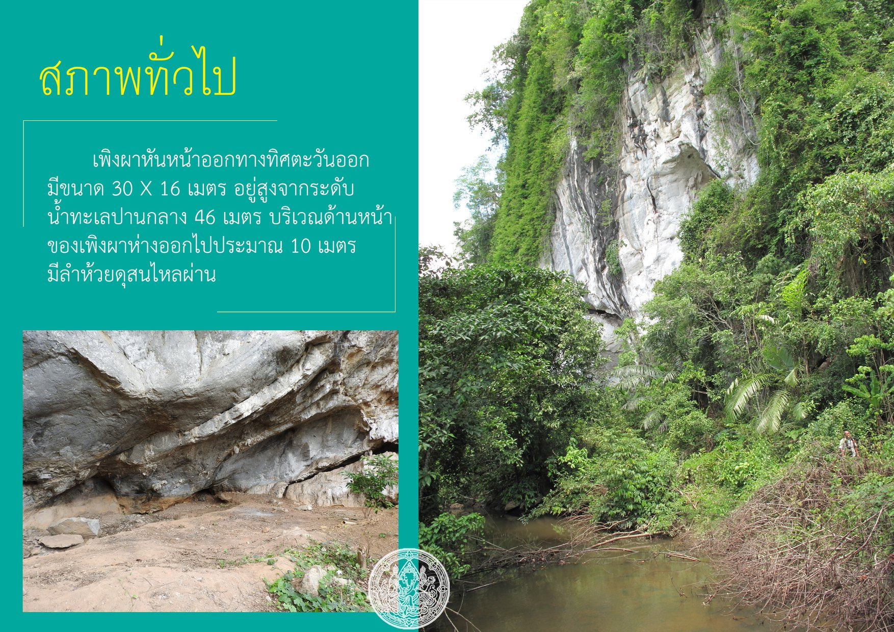 แหล่งโบราณคดีมีลักษณะเป็นเพิงผาหันหน้าออกทางทิศตะวันออก มีขนาด ๓๐ X ๑๖ เมตร อยู่สูงจากระดับน้ำทะเลปานกลาง ๔๖ เมตร บริเวณด้านหน้าของเพิงผาห่างออกไปประมาณ ๑๐ เมตร มีลำห้วยดุสนไหลผ่าน