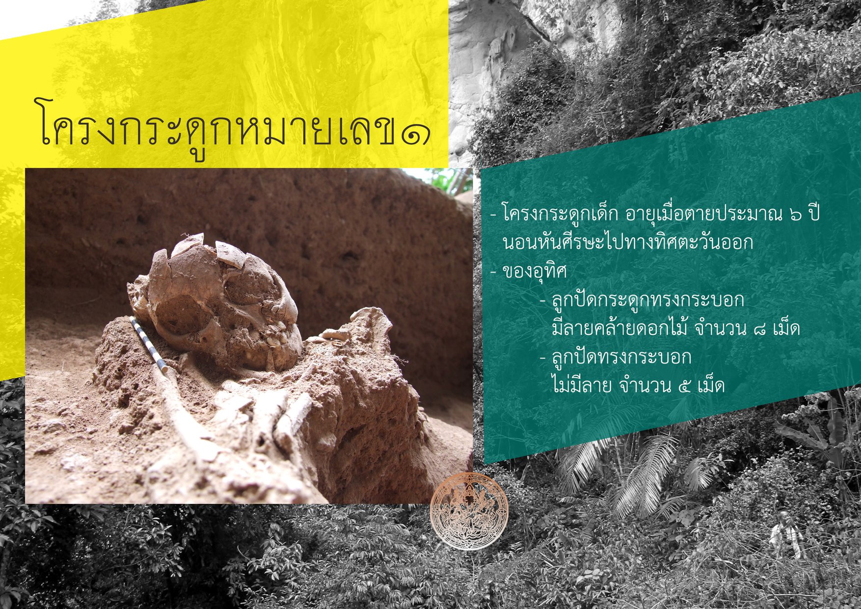 โครงกระดูกหมายเลข ๑ เป็นโครงกระดูกเด็ก อายุเมื่อตายประมาณ ๖ ปี นอนหันศีรษะไปทางทิศตะวันออก โบราณวัตถุที่พบเป็นสิ่งของอุทิศให้แก่ผู้ตาย ได้แก่