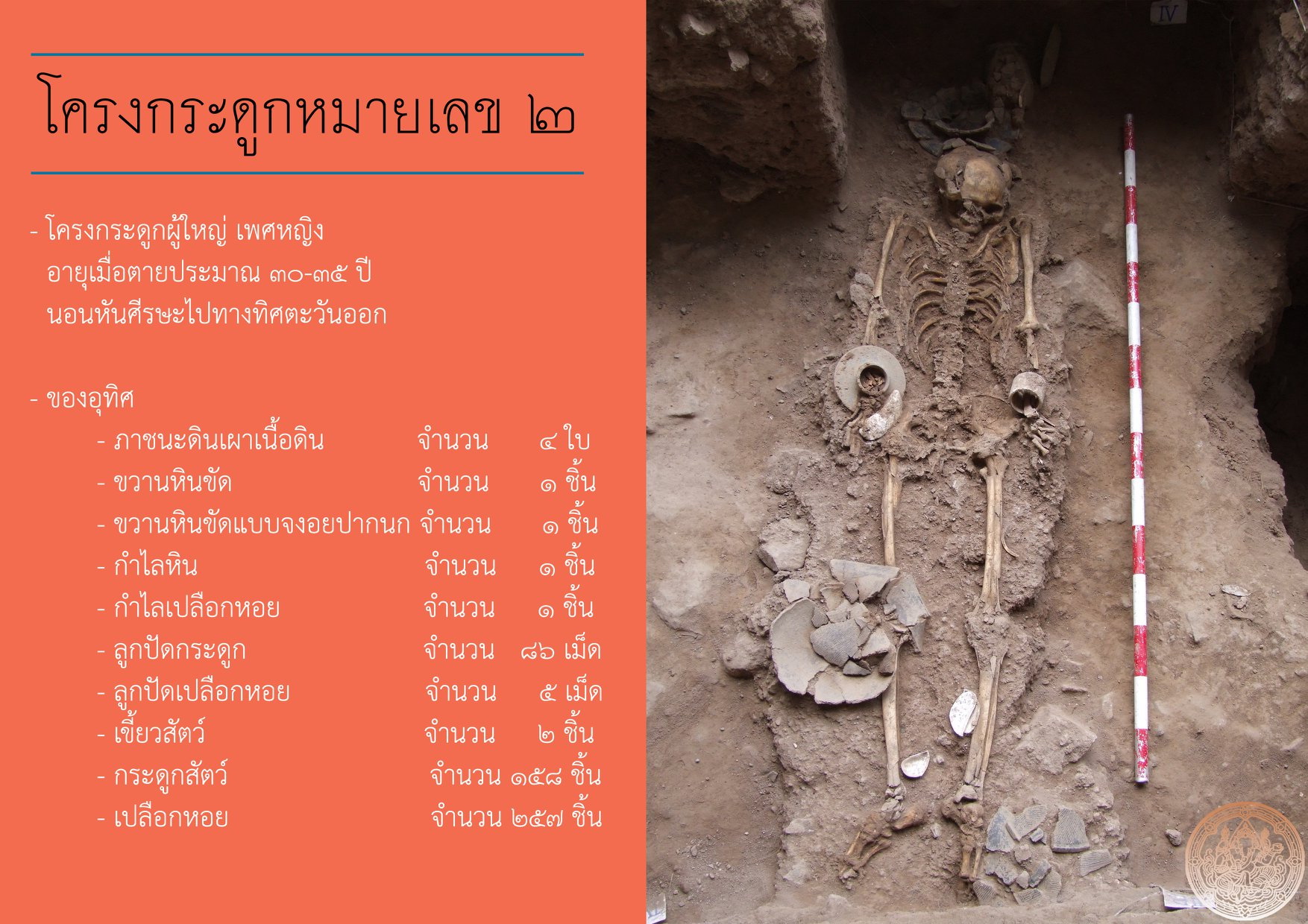 โครงกระดูกหมายเลข ๒ โครงกระดูกผู้ใหญ่ เพศหญิง อายุเมื่อตายประมาณ ๓๐-๓๕ ปี นอนหันศีรษะไปทางทิศตะวันออก โบราณวัตถุที่พบเป็นสิ่งของอุทิศให้แก่ผู้ตาย ได้แก่