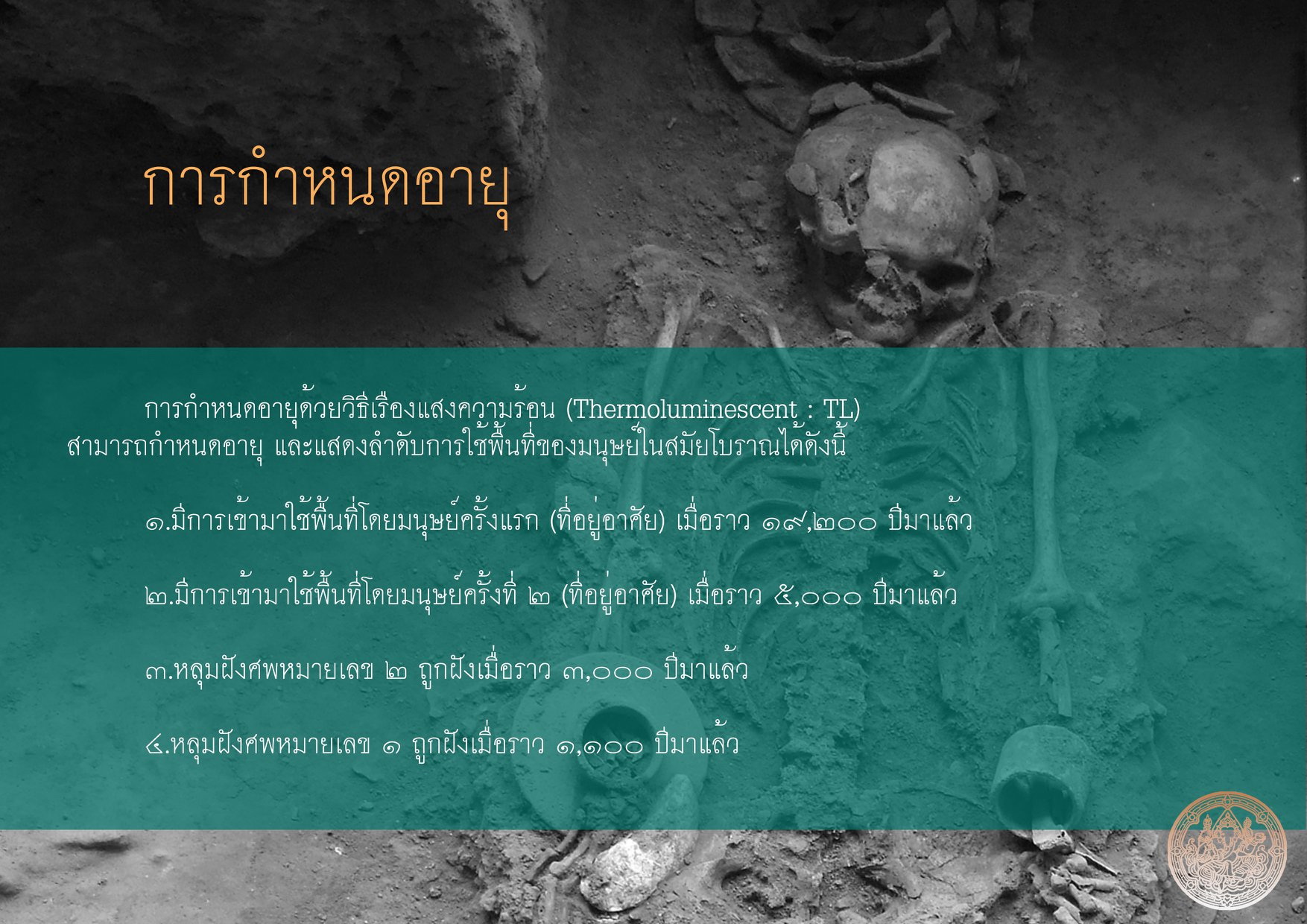 การกำหนดอายุด้วยวิธีเรืองแสงความร้อน (Thermoluminescent : TL) สามารถกำหนดอายุ และแสดงลำดับการใช้พื้นที่บริเวณเพิงผาปาโต๊ะโระ ของมนุษย์ในสมัยโบราณได้ดังนี้ ๑.มีการเข้ามาใช้พื้นที่โดยมนุษย์ครั้งแรก (ที่อยู่อาศัย) เมื่อราว ๑๙,๒๐๐ ปีมาแล้ว ๒.มีการเข้ามาใช้พื้นที่โดยมนุษย์ครั้งที่ ๒ (ที่อยู่อาศัย) เมื่อราว ๕,๐๐๐ ปีมาแล้ว ๓.หลุมฝังศพหมายเลข ๒ ถูกฝังเมื่อราว ๓,๐๐๐ ปีมาแล้ว ๔.หลุมฝังศพหมายเลข ๑ ถูกฝังเมื่อราว ๑,๑๐๐ ปีมาแล้ว