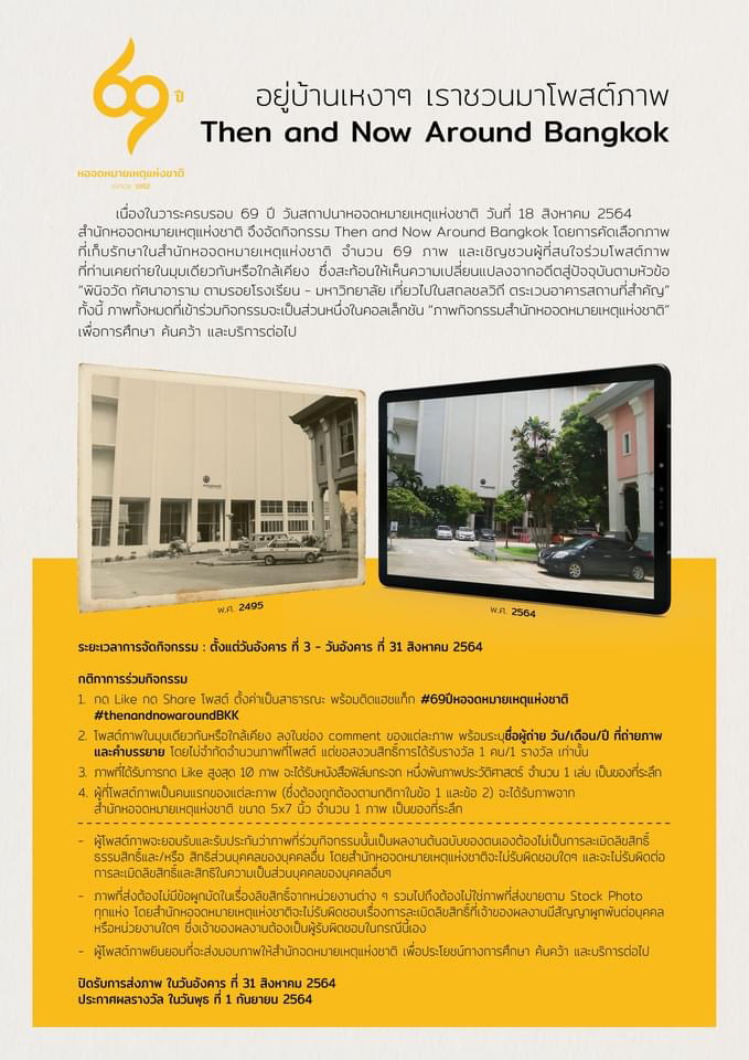 ขอเชิญชวนร่วมกิจกรรม Then and Now Around Bangkok เนื่องในวาระครบรอบ ๖๙ ปี วันสถาปนาหอจดหมายเหตุแห่งชาติ