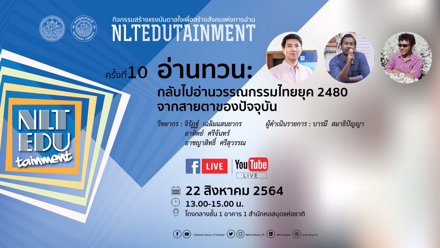 ขอเชิญชมการถ่ายทอดสดกิจกรรมสร้างแรงบันดาลใจเพื่อสร้างสังคมแห่งการอ่าน "อ่านทวน: กลับไปอ่านวรรณกรรมไทยยุค ๒๔๘๐ จากสายตาของปัจจุบัน"