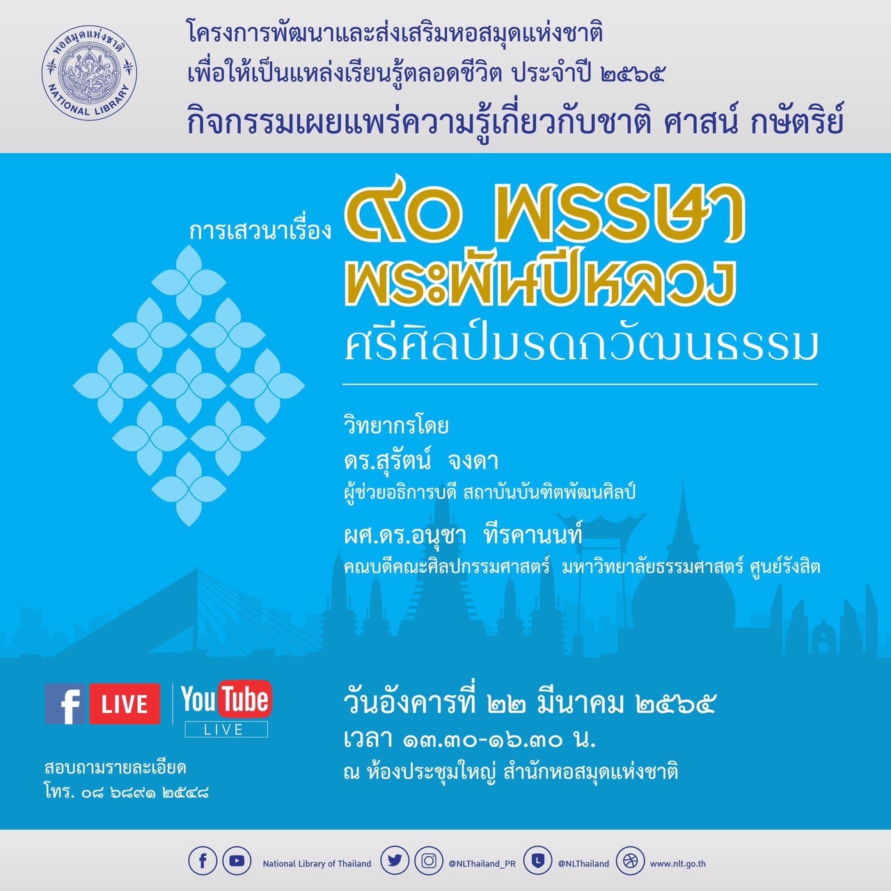 สำนักหอสมุดแห่งชาติ ขอเชิญร่วมกิจกรรมเผยแพร่ความรู้เกี่ยวกับชาติ ศาสน์ กษัตริย์ รับฟังการเสวนาเรื่อง "90 พรรษา พระพันปีหลวง ศรีศิลป์มรดกวัฒนธรรม" วิทยากรโดย ดร.สุรัตน์ จงดา ผู้ช่วยอธิการบดี สถาบันบัณฑิตพัฒนศิลป์ และ ผศ.ดร.อนุชา ทีรคานนท์ คณบดีคณะศิลปกรรมศาสตร์ มหาวิทยาลัยธรรมศาสตร์ ศูนย์รังสิต ในวันที่ 22 มีนาคม 2565 ตั้งแต่เวลา 13.30 น. เป็นต้นไป ณ ห้องประชุมใหญ่ สำนักหอสมุดแห่งชาติ พร้อมทั้งสามารถรับการถ่ายทอดสดผ่าน Facebook Live : National Library of Thailand และ YouTube Live หอสมุดแห่งชาติได้อีกด้วย