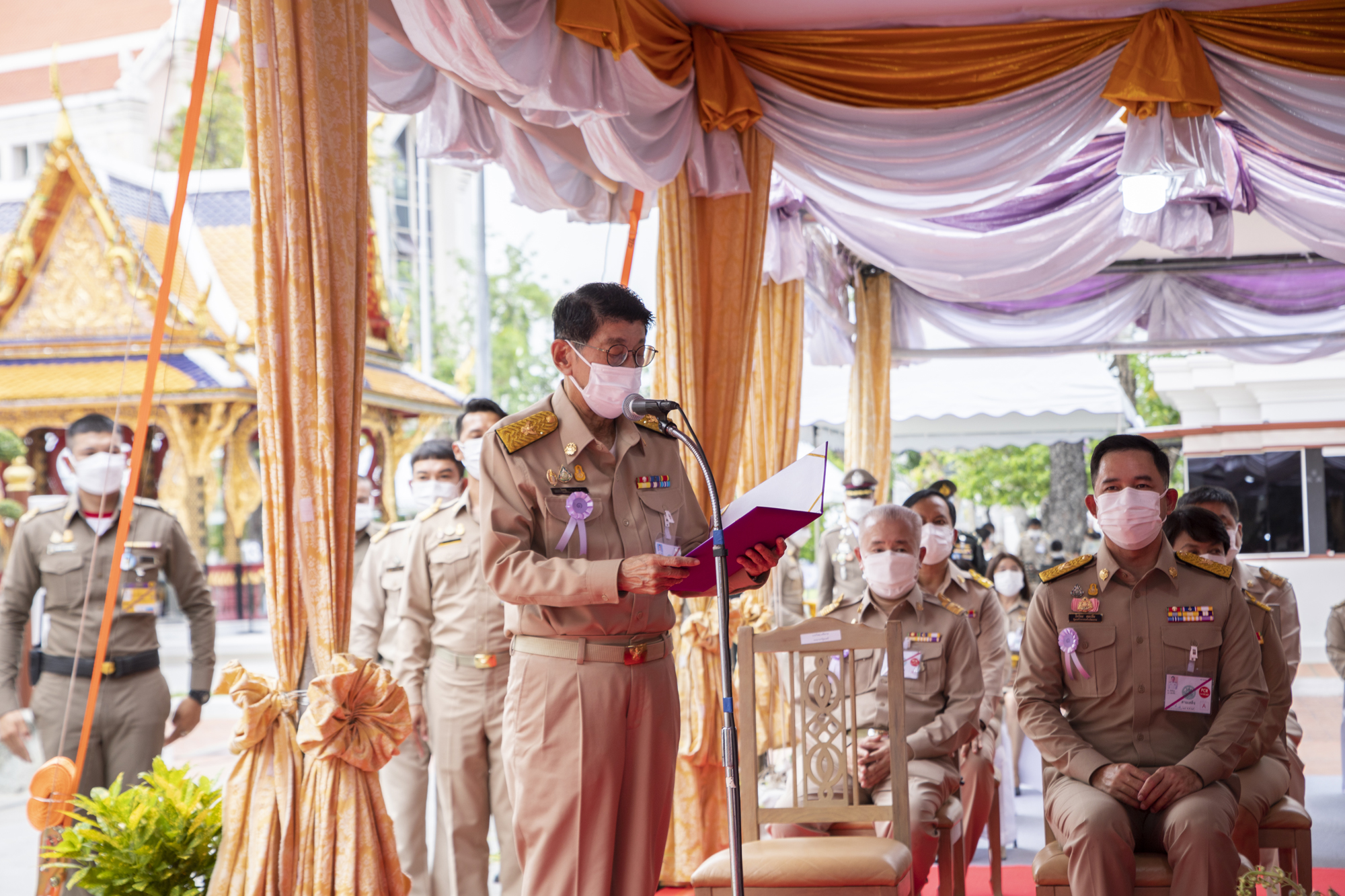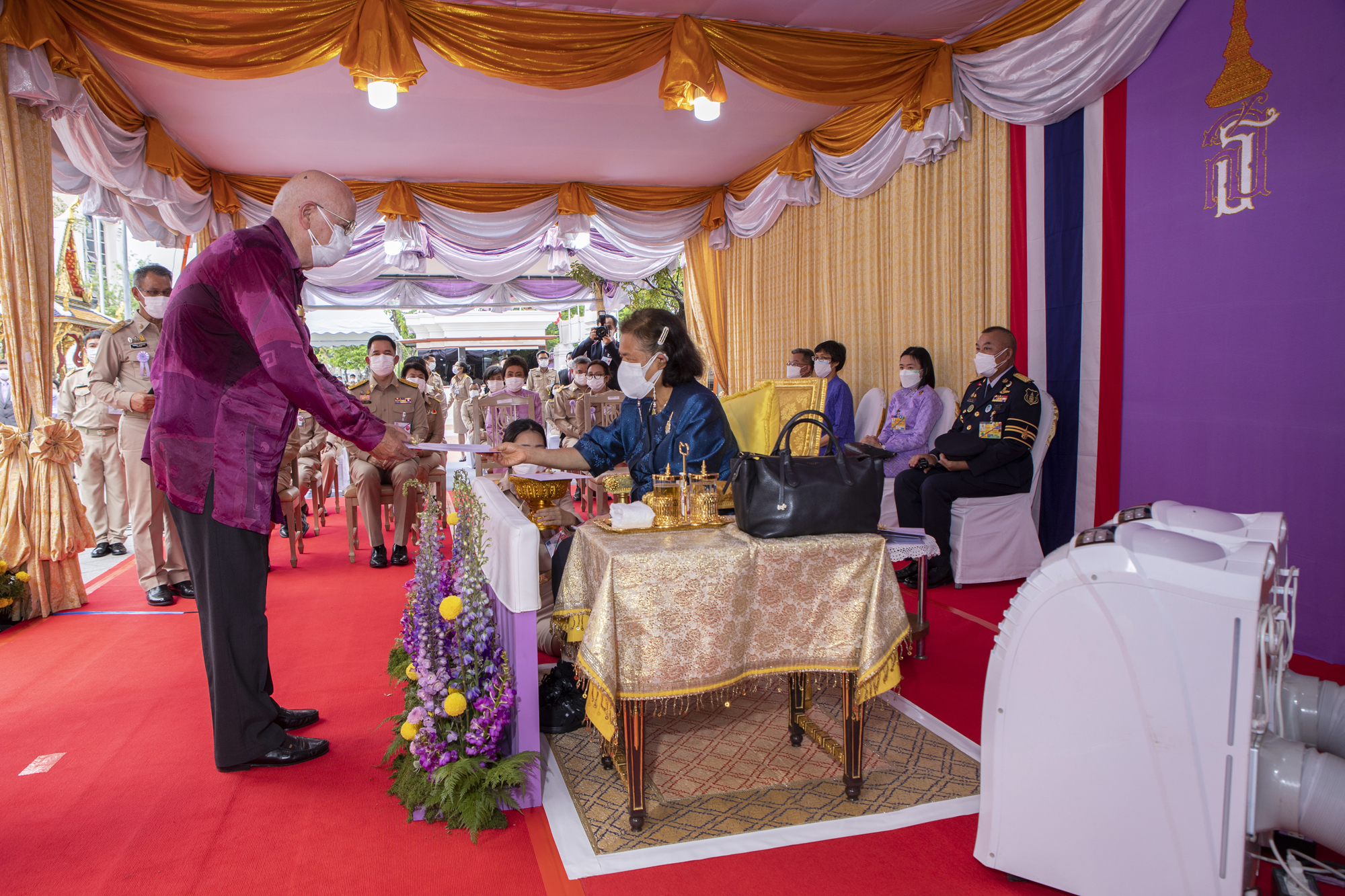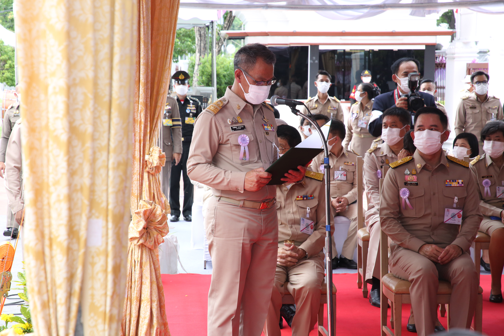 นายวิษณุ เครืองาม รองนายกรัฐมนตรี กราบบังคมทูลรายงานวัตถุประสงค์การจัดนิทรรศการฯ นายกิตติพันธ์ พานสุวรรณ อธิบดีกรมศิลปากร กราบบังคมทูลเบิกผู้อนุรักษ์มรดกไทยดีเด่นและผู้สนับสนุนการดำเนินงานด้านศิลปวัฒนธรรมของชาติ พุทธศักราช ๒๕๖๔ – ๒๕๖๕ จำนวน ๕๐ ราย เข้ารับพระราชทานเข็มเกียรติคุณวันอนุรักษ์มรดกไทย