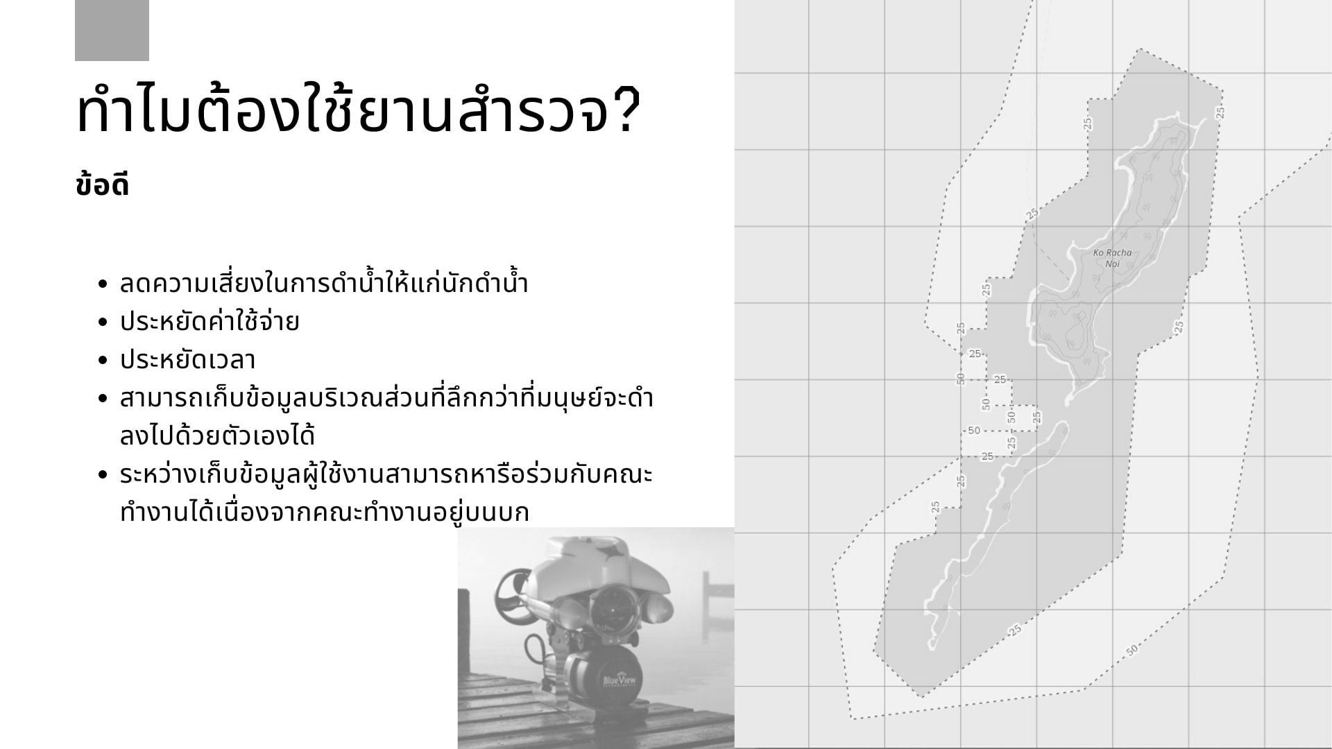 ยานสำรวจก็เป็นเครื่องมือหนึ่งที่ใช้สำหรับการสำรวจแหล่งเรือจม หรือแหล่งโบราณคดีใต้น้ำ ของกองโบราณคดีใต้น้ำ ซึ่งยานสำรวจนั้น มีข้อดีหลักๆ คือช่วยลดอัตราความเสี่ยงของบุคคลากรกองโบราณคดีใต้น้ำในการลงดำน้ำเพื่อการสำรวจในพื้นที่ที่มีความลึก นอกจากนี้ ยังมีข้อดีอีกหลายอย่าง รวมถึงมีส่วนประกอบที่ช่วยอำนวยความสะดวกให้แก่ผู้ใช้งานจำนวนหลายส่วน ซึ่งสามารถรับชมได้จากภาพประกอบ