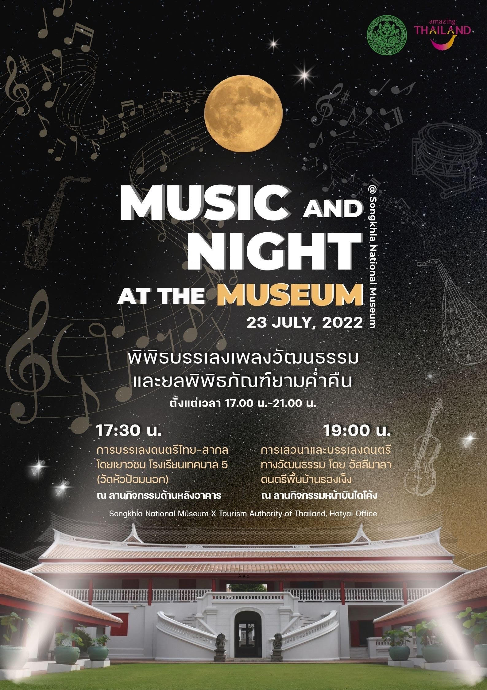 เปิดประสบการณ์ใหม่ ครั้งแรกที่พิพิธภัณฑสถานแห่งชาติ สงขลา ร่วมกับการท่องเที่ยวแห่งประเทศไทย สำนักงานหาดใหญ่ ขอเชิญชวนทุกท่านมาร่วมรับฟังดนตรีในพิพิธภัณฑ์ กับกิจกรรม “พิพิธบรรเลงเพลงวัฒนธรรม Music and Night at the Museum ” ตลอดจนชวนมาทอดน่องเรียนรู้ประวัติศาสตร์ในกิจกรรม “ยลพิพิธภัณฑ์ยามค่ำคืน” ในวันเสาร์ที่ 23 กรกฎาคม 2565 ตั้งแต่เวลา 17.00น. - 21.00น.