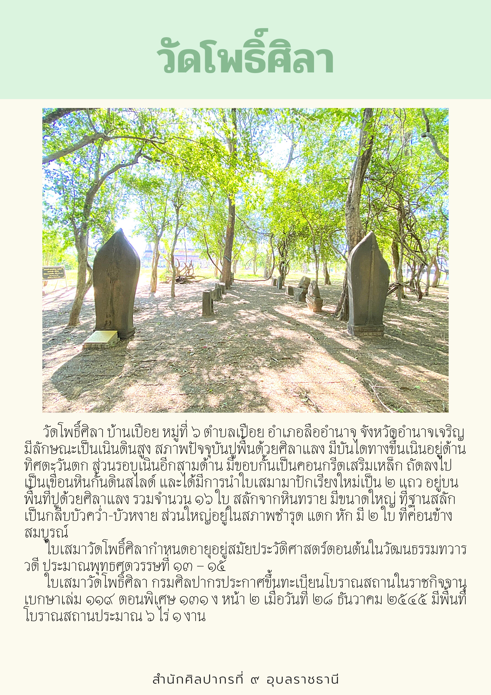 วัดโพธิ์ศิลา บ้านเปือย หมู่ที่ ๖ ตำบลเปือย อำเภอลืออำนาจ จังหวัดอำนาจเจริญ มีลักษณะเป็นเนินดินสูง สภาพปัจจุบันปูพื้นด้วยศิลาแลง มีบันไดทางขึ้นเนินอยู่ด้านทิศตะวันตก ส่วนรอบเนินอีกสามด้าน มีขอบกั้นเป็นคอนกรีตเสริมเหล็ก ถัดลงไปเป็นเขื่อนหินกั้นดินสไลด์ และได้มีการนำใบเสมามาปักเรียงใหม่เป็น ๒ แถว อยู่บนพื้นที่ปูด้วยศิลาแลง รวมจำนวน ๑๖ ใบ สลักจากหินทราย มีขนาดใหญ่ ที่ฐานสลักเป็นกลีบบัวคว่ำ-บัวหงาย ส่วนใหญ่อยู่ในสภาพชำรุด แตก หัก มี ๒ ใบ ที่ค่อนข้างสมบูรณ์ ใบเสมาวัดโพธิ์ศิลากำหนดอายุอยู่สมัยประวัติศาสตร์ตอนต้นในวัฒนธรรมทวารวดี ประมาณพุทธศตวรรษที่ ๑๓ – ๑๕