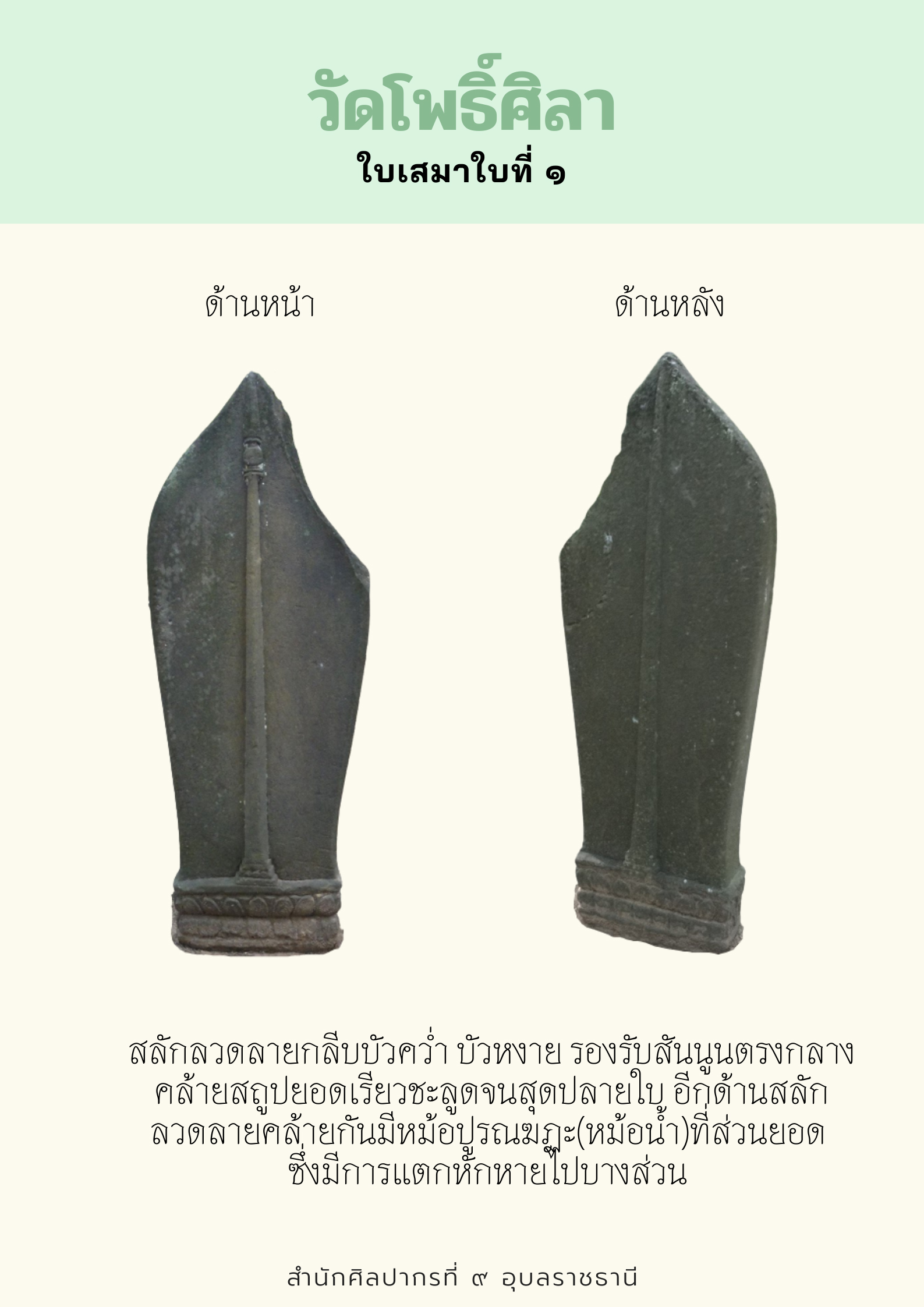 เสมาใบที่ ๑ สลักลวดลายกลีบบัวคว่ำ บัวหงาย รองรับสันนูนตรงกลางคล้ายสถูปยอดเรียวชะลูดจนสุดปลายใบ อีกด้านสลักลวดลายคล้ายกันมีหม้อปูรณฆฏะ(หม้อน้ำ)ที่ส่วนยอด ซึ่งมีการแตกหักหายไปบางส่วน