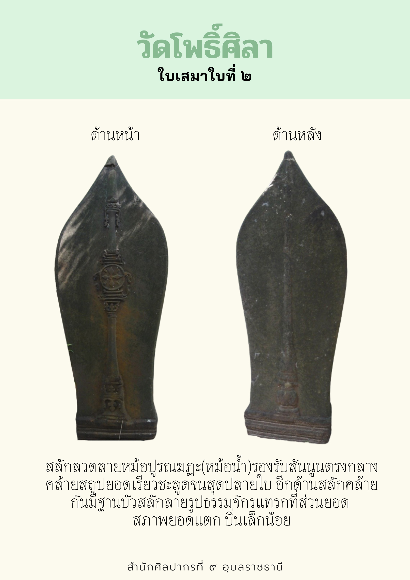 เสมาใบที่ ๒ สลักลวดลายหม้อปูรณฆฏะ(หม้อน้ำ)รองรับสันนูนตรงกลางคล้ายสถูปยอดเรียวชะลูดจนสุดปลายใบ อีกด้านสลักคล้ายกันมีฐานบัวสลักลายรูปธรรมจักรแทรกที่ส่วนยอด สภาพยอดแตก บิ่นเล็กน้อย