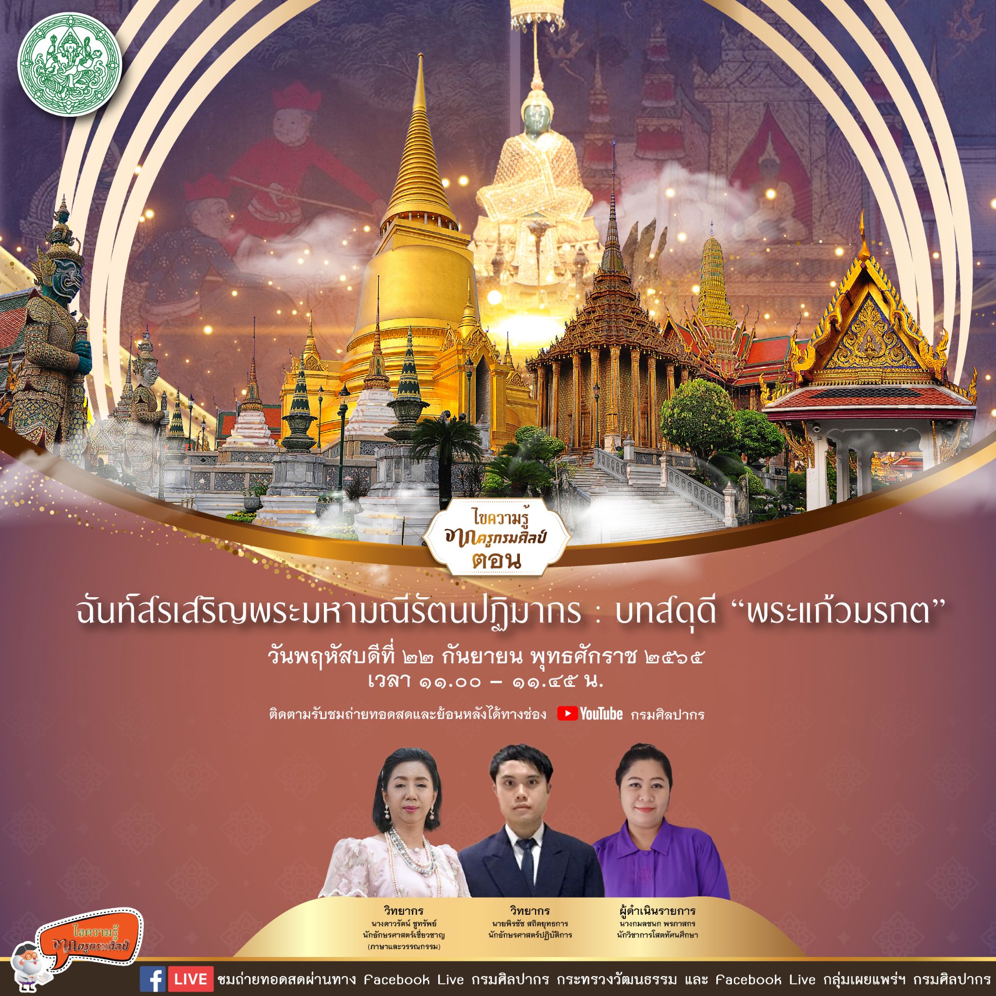ขอเชิญรับชม Facebook Live รายการไขความรู้จากครูกรมศิลป์ ฉันท์สรเสริญพระมหามณีรัตนปฏิมากร : บทสดุดี “พระแก้วมรกต”