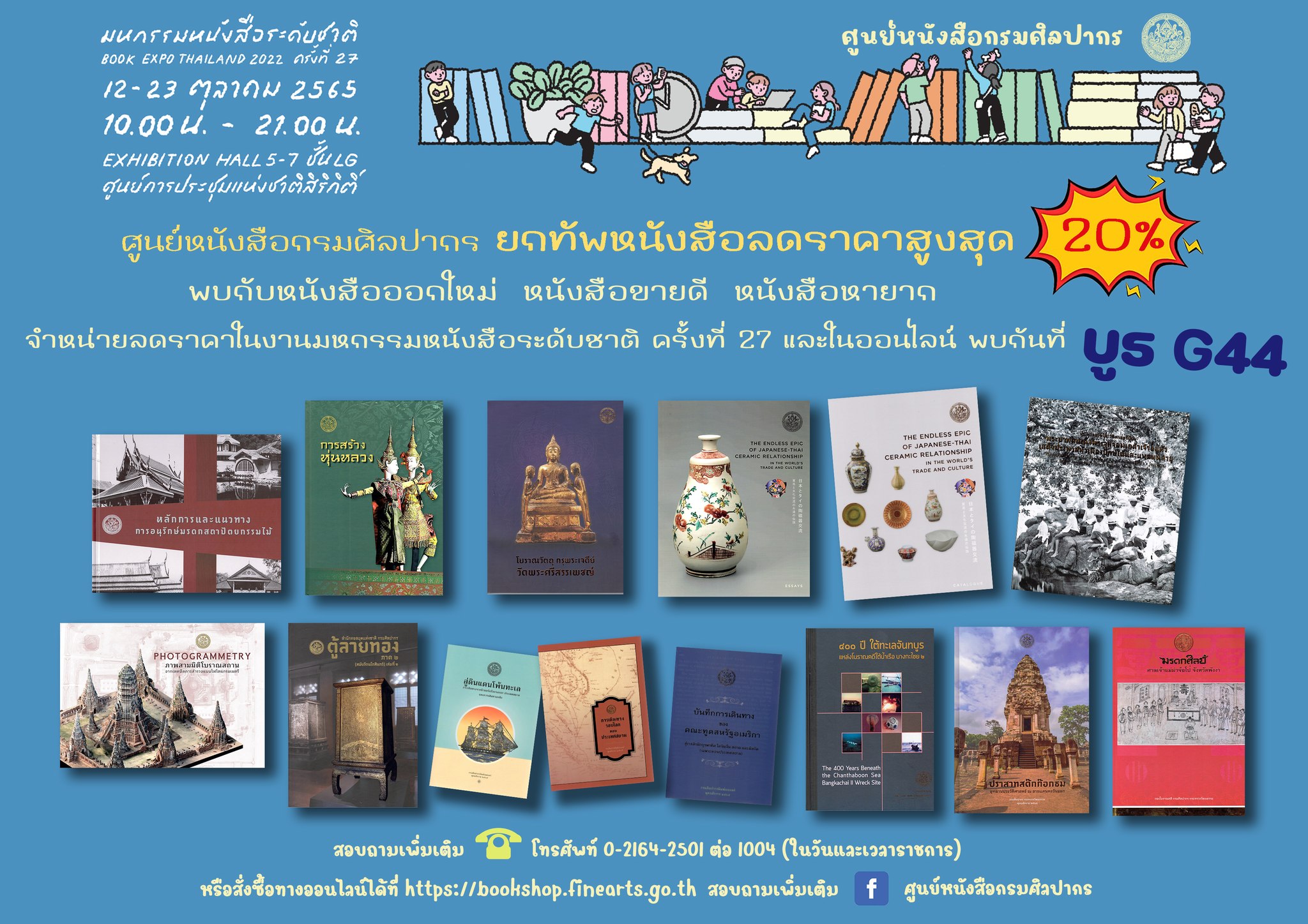 กรมศิลปากร โดยศูนย์หนังสือกรมศิลปากร ร่วมจำหน่ายหนังสือในงานมหกรรมหนังสือระดับชาติ ครั้งที่ ๒๗ ทั้งหนังสือออกใหม่ หนังสือเก่า และหนังสือหายาก ลดราคาสูงสุดถึง ๒๐% ตั้งแต่วันที่ ๑๒ - ๒๓ ตุลาคม ๒๕๖๕ ณ ศูนย์การประชุมแห่งชาติสิริกิติ์ ฮอลล์ ๕ - ๗ ชั้น LG บูธ G ๔๔ หรือสั่งซื้อทางออนไลน์ได้ที่ https://bookshop.finearts.go.th