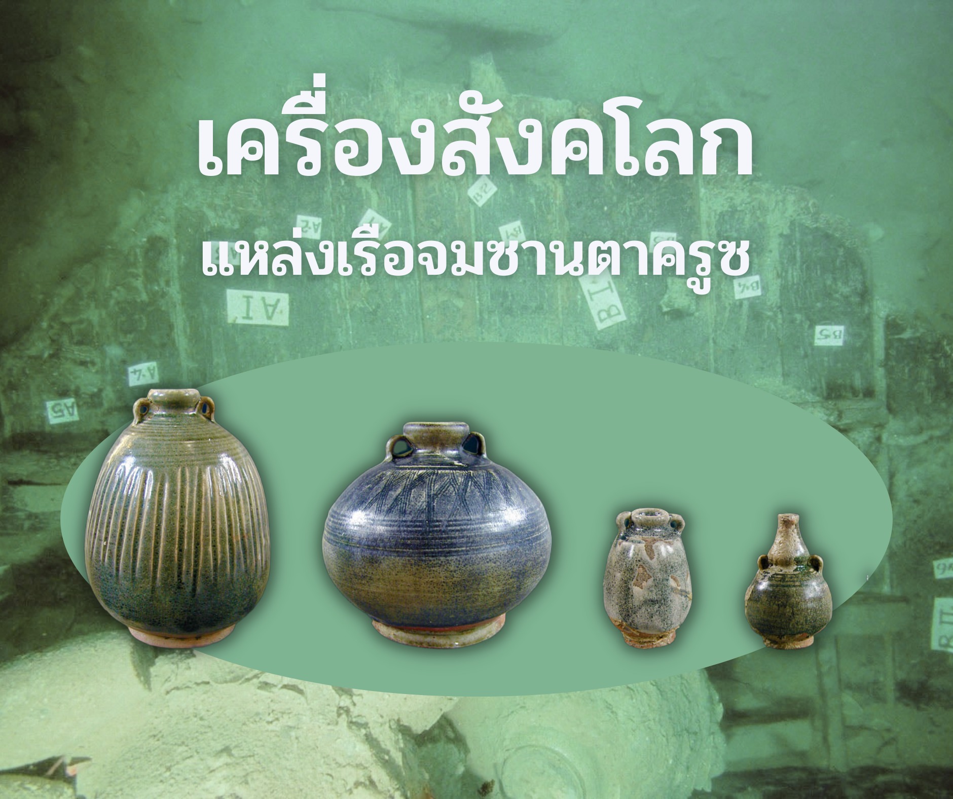 ส่วนเครื่องสังคโลกเคลือบสีเขียวไข่กา (celadon) ซึ่งเป็นผลิตภัณฑ์จากแหล่งเตาเมืองศรีสัชนาลัย จังหวัดสุโขทัย พบที่แหล่งเรือจมซานตาครูซ ประกอบด้วย ขวดทรงกลม ขวดทรงยาวมีหูหิ้วสองอัน ขวดแบบมีหู และขวดขาดเล็กทรงน้ำเต้า