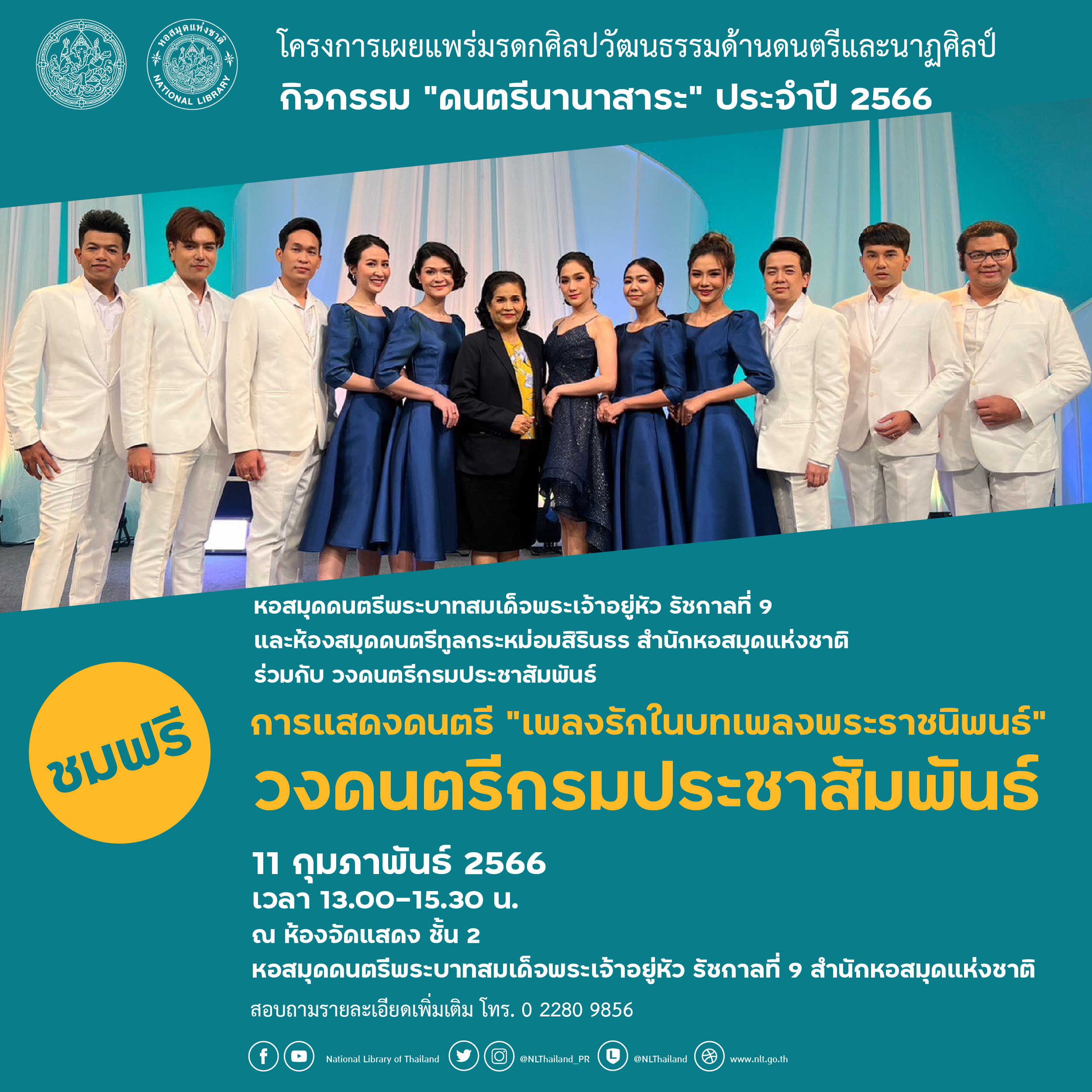 กรมศิลปากร กระทรวงวัฒนธรรม โดยหอสมุดดนตรีพระบาทสมเด็จพระเจ้าอยู่หัว รัชกาลที่ ๙ สำนักหอสมุดแห่งชาติ ขอเชิญชมการแสดงดนตรี “เพลงรักในบทเพลงพระราชนิพนธ์” โดยวงดนตรีกรมประชาสัมพันธ์ ในวันเสาร์ที่ ๑๑ กุมภาพันธ์ ๒๕๖๖ เวลา ๑๓.๐๐ - ๑๕.๓๐ น. ณ ห้องจัดแสดง ชั้น ๒ หอสมุดดนตรีพระบาทสมเด็จพระเจ้าอยู่หัว รัชกาลที่ ๙ สำนักหอสมุดแห่งชาติ