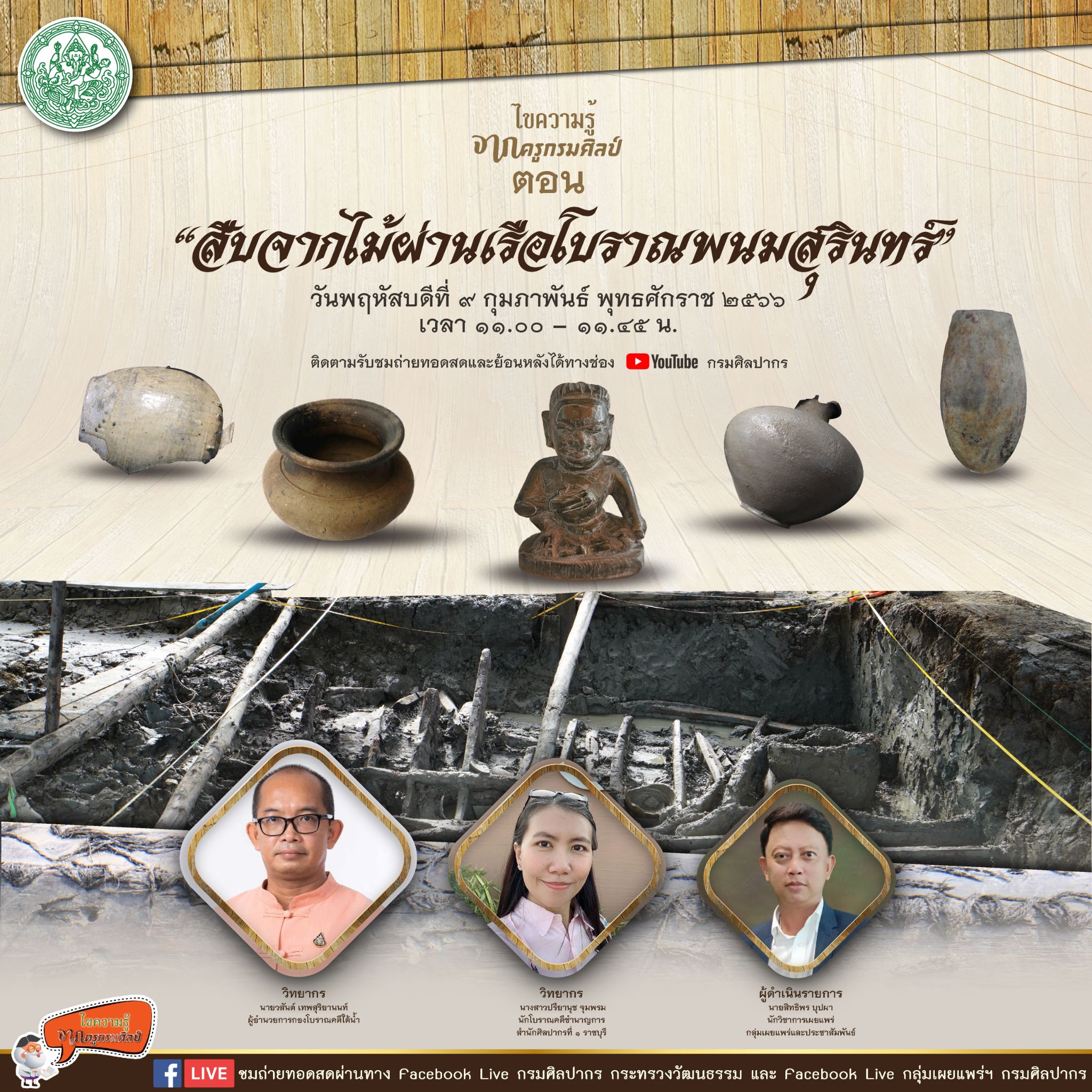 ขอเชิญรับชม Facebook Live รายการไขความรู้จากครูกรมศิลป์ “สืบจากไม้ผ่านเรือโบราณพนมสุรินทร์ ”