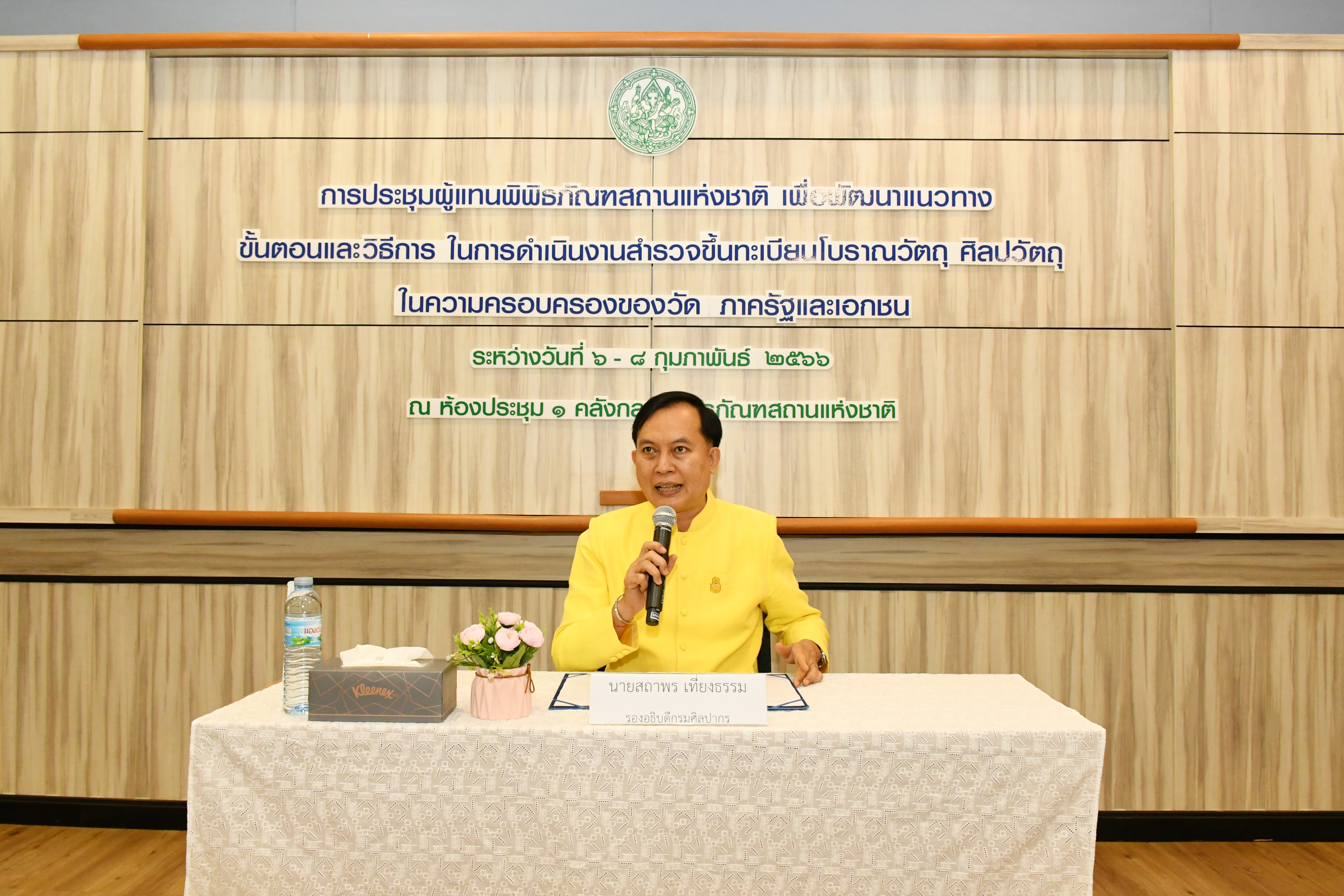 วันจันทร์ที่ ๖ กุมภาพันธ์ พ.ศ.๒๕๖๖ เวลา ๐๙.๓๐ น. นายสถาพร เที่ยงธรรม รองอธิบดีกรมศิลปากรเป็นประธานเปิดการประชุมผู้แทนพิพิธภัณฑสถานแห่งชาติเพื่อพัฒนาแนวทาง ขั้นตอนและวิธีการในการดำเนินงานสำรวจขึ้นทะเบียนโบราณวัตถุ ศิลปวัตถุในความครอบครองของวัด ภาครัฐและเอกชน ณ ห้องประชุม ๑ คลังกลางพิพิธภัณฑสถานแห่งชาติ ตำบลคลองห้า อำเภอคลองหลวง จังหวัดปทุมธานี โดยมีนางสาวนิตยา กนกนมงคล ผู้อำนวยการสำนักพิพิธภัณฑสถานแห่งชาติ กล่าวรายงานวัตถุประสงค์การประชุมครั้งนี้ เพื่อระดมความคิดเห็น ให้คำปรึกษา คำแนะนำ สำหรับพัฒนาวิธีการทำงานสำรวจโบราณวัตถุ ศิลปวัตถุในครอบครองชองวัด ภาครัฐและเอกชนให้เป็นไปในทิศทางเดียวกัน ลดปัญหาอุปสรรคการทำงาน เพิ่มประสิทธิภาพและศักยภาพของเจ้าหน้าที่ผู้ปฏิบัติงาน โดยมีคณะกรรมการ ผู้ทรงคุณวุฒิ ผู้เชี่ยวชาญ พร้อมด้วยภัณฑารักษ์และเจ้าหน้าที่พิพิธภัณฑ์จากพิพิธภัณฑสถานแห่งชาติส่วนภูมิภาค รวมทั้งสิ้น ๕๓ คน เข้าร่วมประชุม