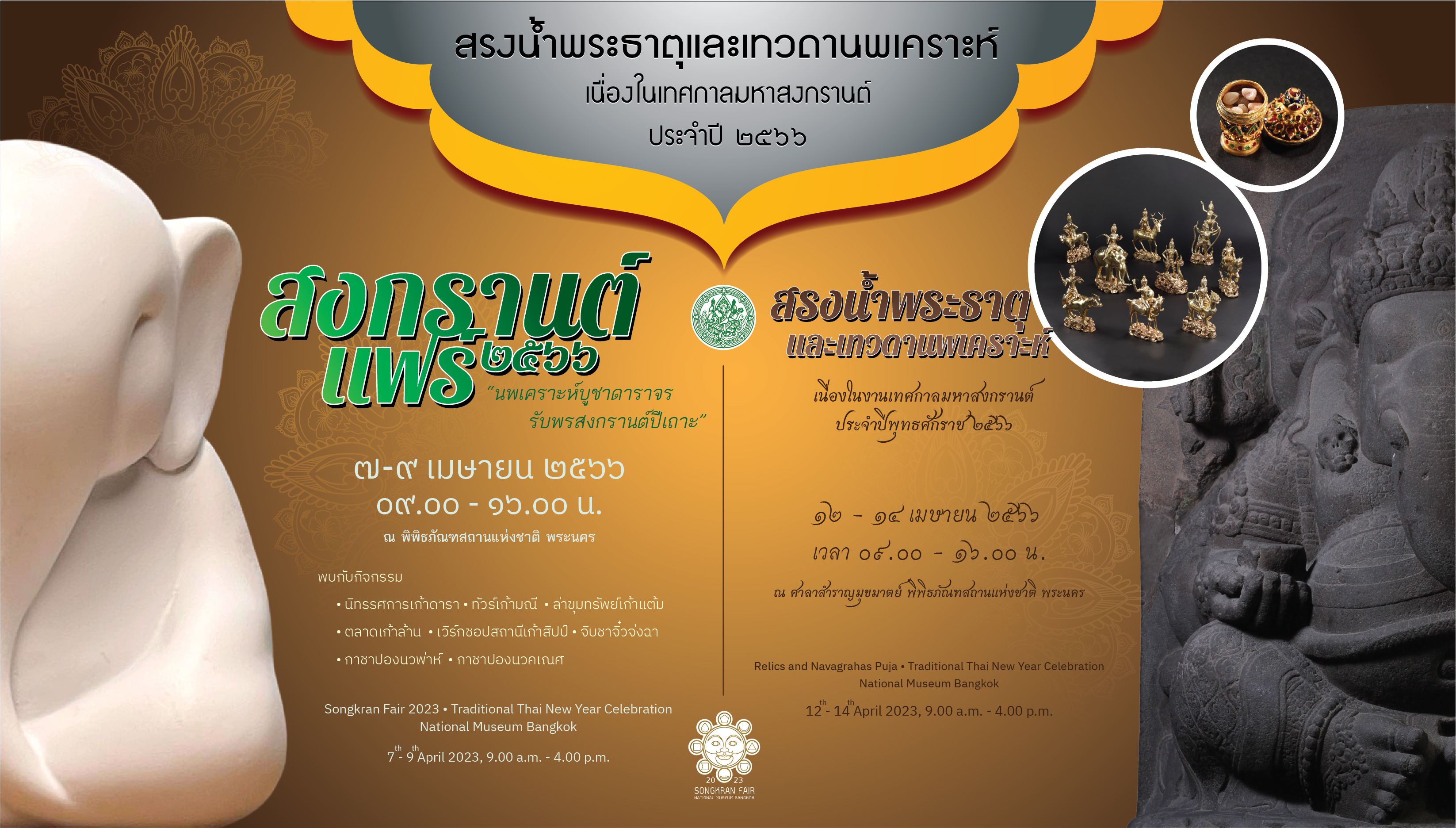 กรมศิลปากร ขอเชิญร่วมกิจกรรมเนื่องในเทศกาลมหาสงกรานต์ พุทธศักราช 2566 ณ พิพิธภัณฑสถานแห่งชาติ พระนคร รับความรู้คู่ความสนุกกับ “สงกรานต์แฟร์ : นพเคราะห์บูชาดาราจร รับพรสงกรานต์ปีเถาะ” วันที่ 7 - 9 เมษายน 2566 และร่วมสรงน้ำพระธาตุและเทวดานพเคราะห์ในวันที่ 12 – 14 เมษายน 2566