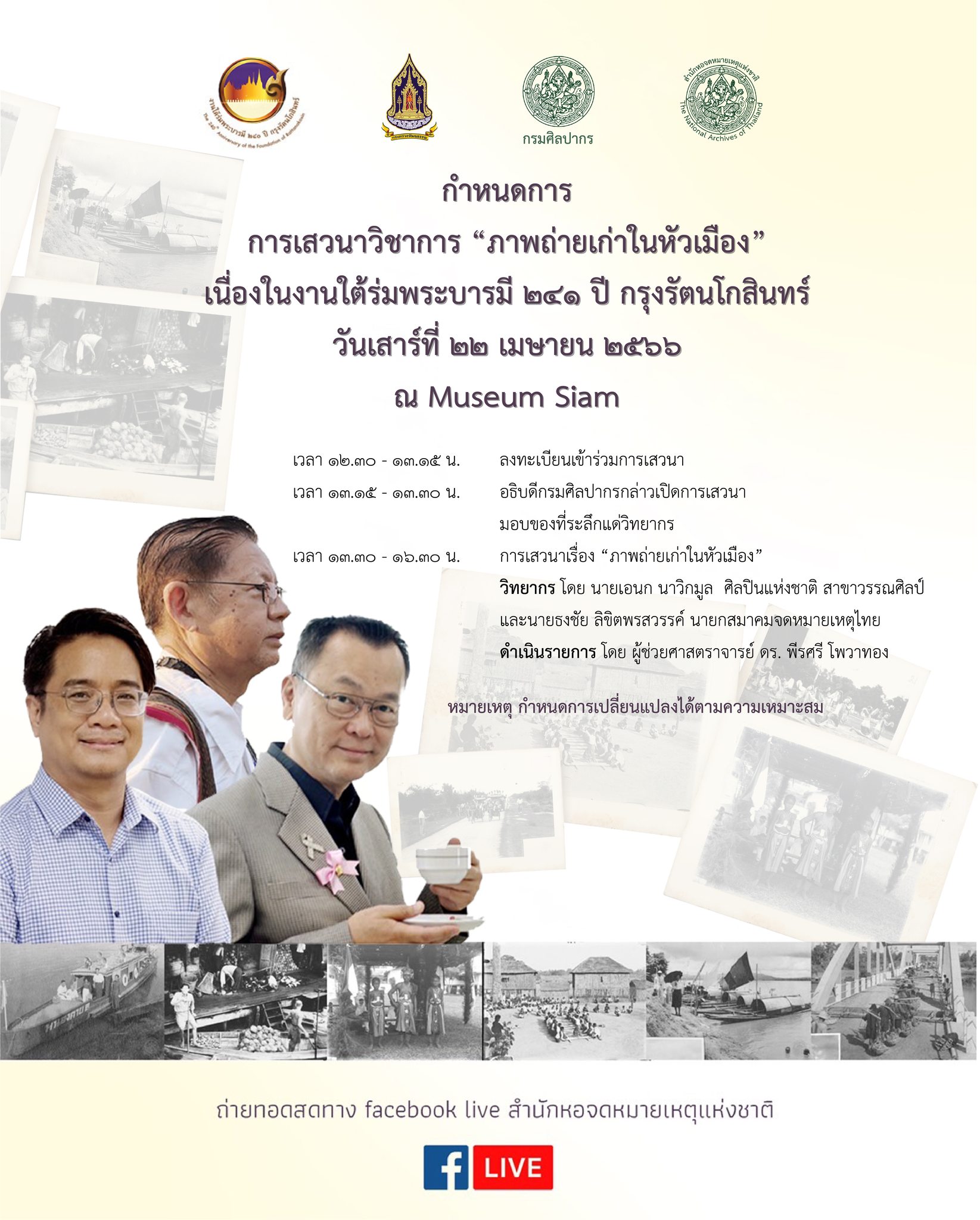 สำนักหอจดหมายเหตุแห่งชาติ กรมศิลปากร ขอเชิญรับชมการถ่ายทอดสด Facebook Live การเสวนาทางวิชาการ ในหัวข้อ "ภาพถ่ายเก่าในหัวเมือง" เนื่องในงานใต้ร่มพระบารมี ๒๔๑ ปี กรุงรัตนโกสินทร์ ณ อาคารอเนกประสงค์ มิวเซียมสยาม วันเสาร์ที่ ๒๒ เมษายน ๒๕๖๖ เวลา ๑๓.๓๐ – ๑๖.๓๐ น. วิทยากรโดย นายเอนก นาวิกมูล ศิลปินแห่งชาติ สาขาวรรณศิลป์ และนายธงชัย ลิขิตพรสวรรค์ นายกสมาคมจดหมายเหตุไทย ดำเนินรายการ โดย ผู้ช่วยศาสตราจารย์ ดร. พีรศรี โพวาทอง