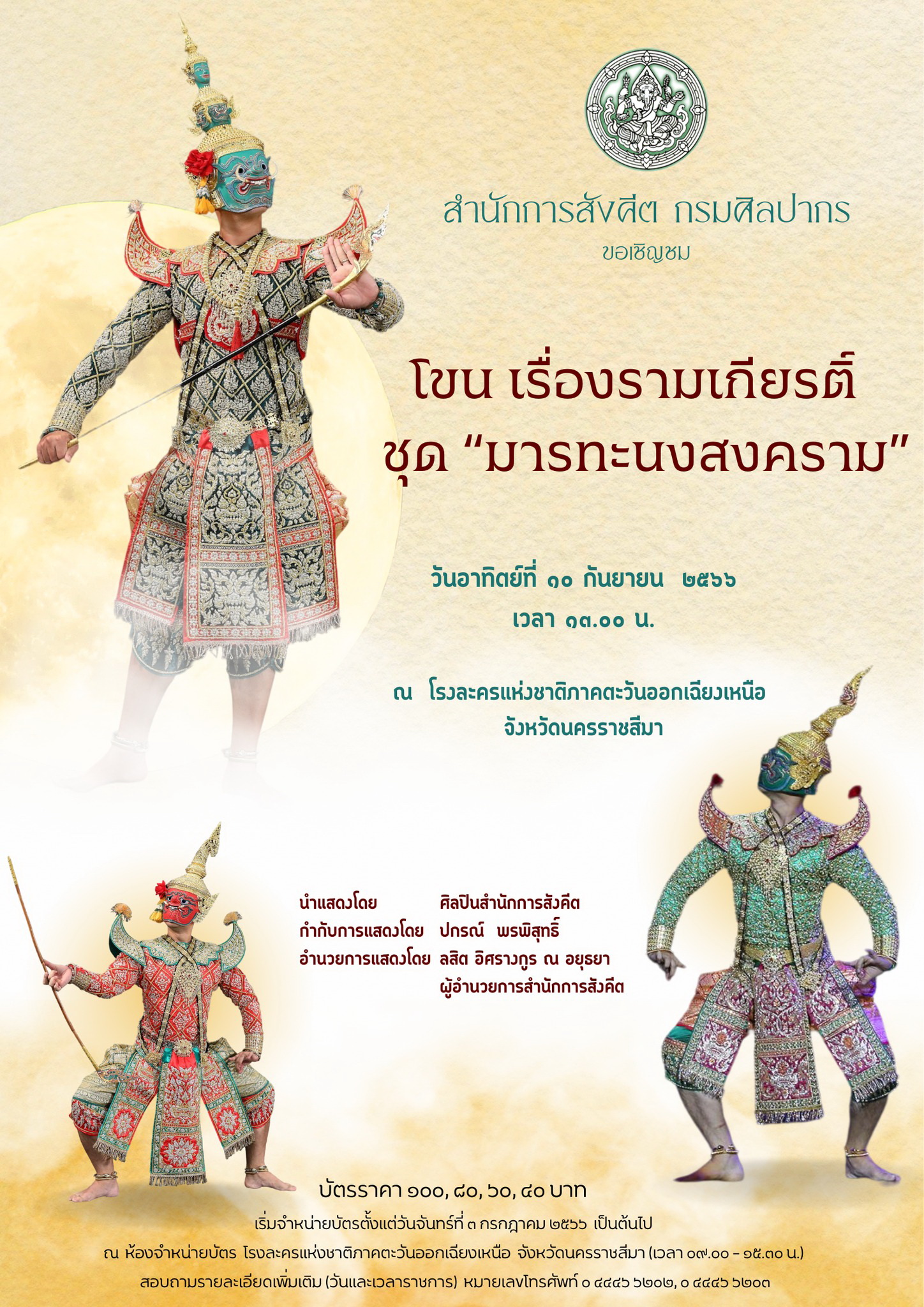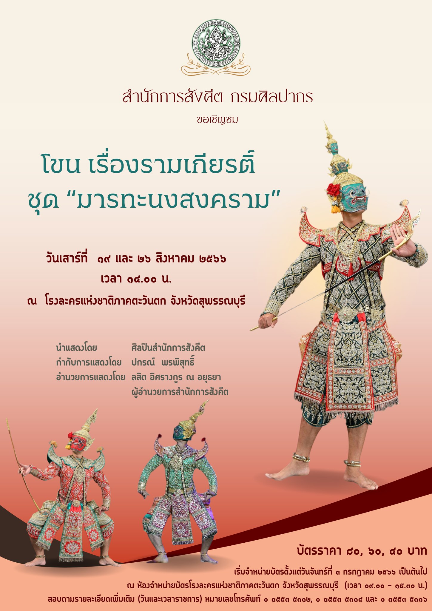 สำนักการสังคีต ขอเชิญชมการแสดงโขน เรื่องรามเกียรติ์ ชุด “มารทะนงสงคราม” ณ โรงละครแห่งชาติภาคตะวันตก จังหวัดสุพรรณบุรี และโรงละครแห่งชาติภาคตะวันออกเฉียงเหนือ จังหวัดนครราชสีมา นำแสดงโดย ศิลปินสำนักการสังคีต กำกับการแสดงโดย ปกรณ์ พรพิสุทธิ์ เริ่มจำหน่ายบัตร ตั้งแต่วันจันทร์ที่ ๓ กรกฎาคม ๒๕๖๖ เป็นต้นไป