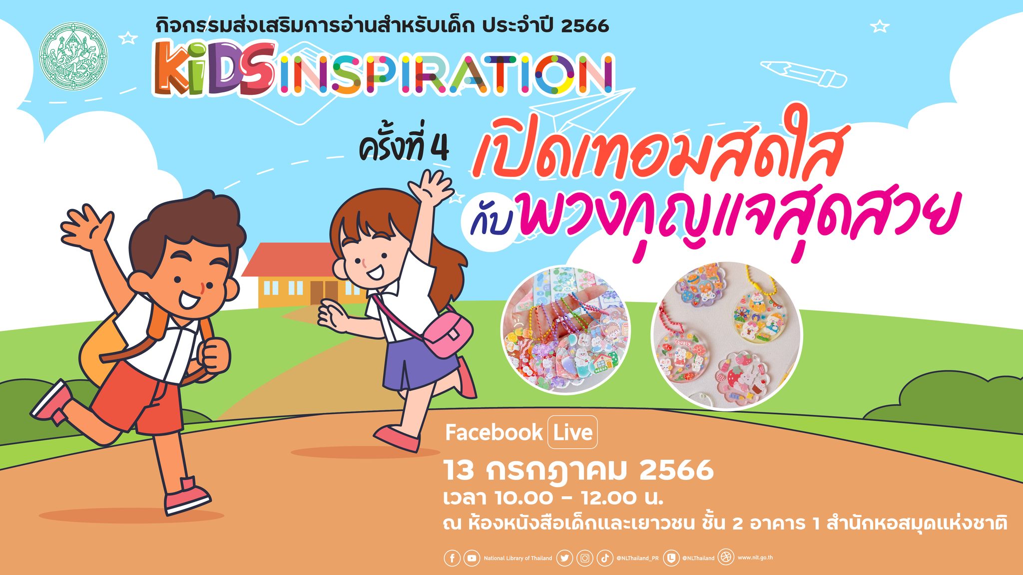สำนักหอสมุดแห่งชาติ ขอเชิญชวนเข้าร่วมกิจกรรมส่งเสริมการอ่านสำหรับเด็ก Kids Inspiration ปีที่ 6 ครั้งที่ 4 ในหัวข้อ "เปิดเทอมสดใส กับพวงกุญแจสุดสวย" ในวันที่ 13 กรกฎาคม 2566 เวลา 10.00 - 12.00 น. ณ ห้องหนังสือเด็กและเยาวชน ชั้น 2 อาคาร 1 สำนักหอสมุดแห่งชาติ