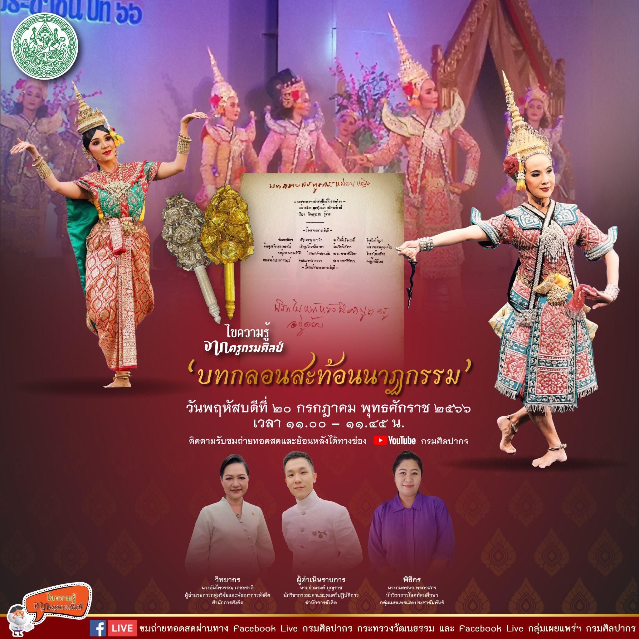 ขอเชิญรับชมถ่ายทอดสด Facebook Live รายการไขความรู้จากครูกรมศิลป์ ตอน "บทกลอนสะท้อนนาฏกรรม"