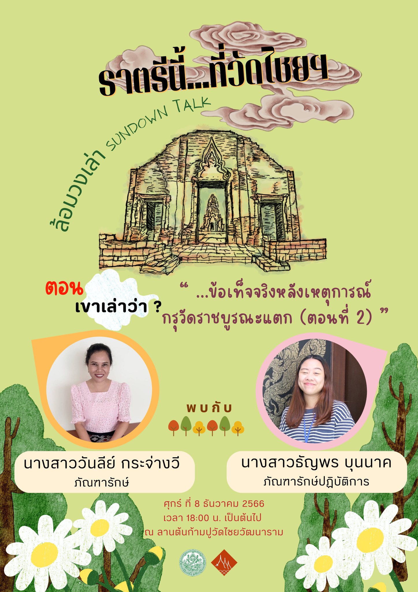 - วันศุกร์ที่ 8 ธันวาคม 2566 กิจกรรมล้อมวงเล่า Sundown Talk "(เขาเล่าว่า?...ข้อเท็จจริงหลังเหตุการณ์กรุวัดราชบูรณะแตก (ตอนที่ 2)" โดยพิพิธภัณฑสถานแห่งชาติ เจ้าสามพระยา
