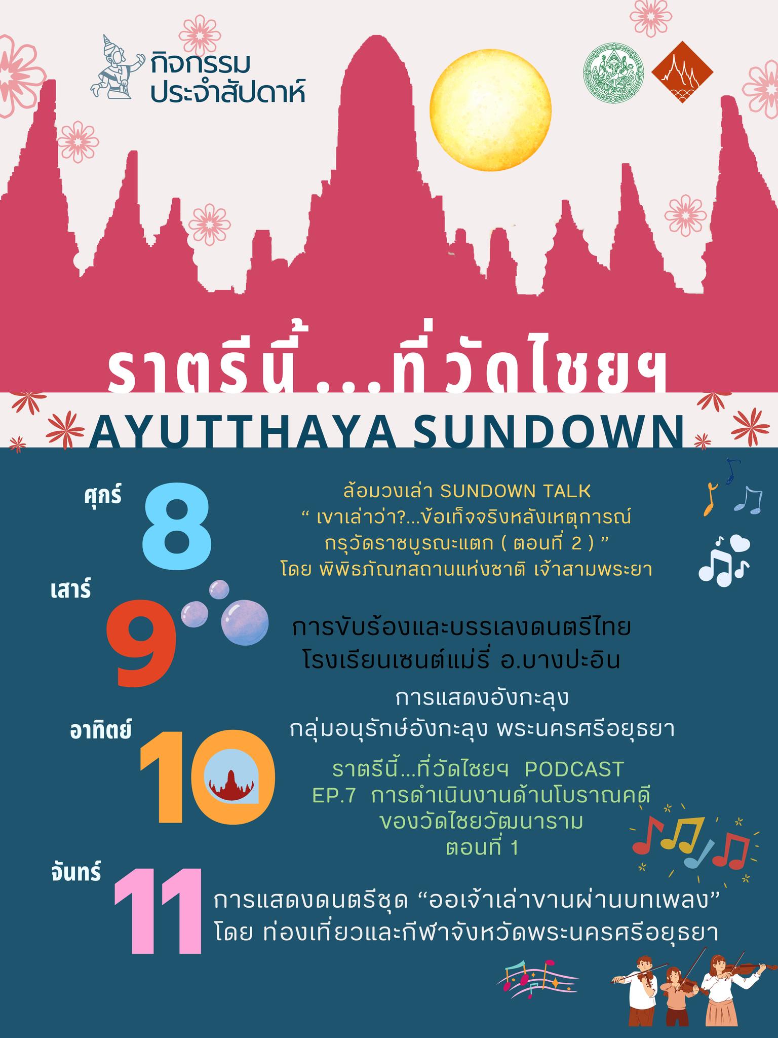 - วันอาทิตย์ที่ 10 ธันวาคม 2566 การแสดงอังกะลุง จากกลุ่มอนุรักษ์อังกะลุง พระนครศรีอยุธยา และกิจกรรม ราตรีนี้...ที่วัดไชยฯ PODCAST EP.7 การดำเนินงานด้านโบราณคดีของวัดไชยวัฒนาราม ตอนที่ 1
